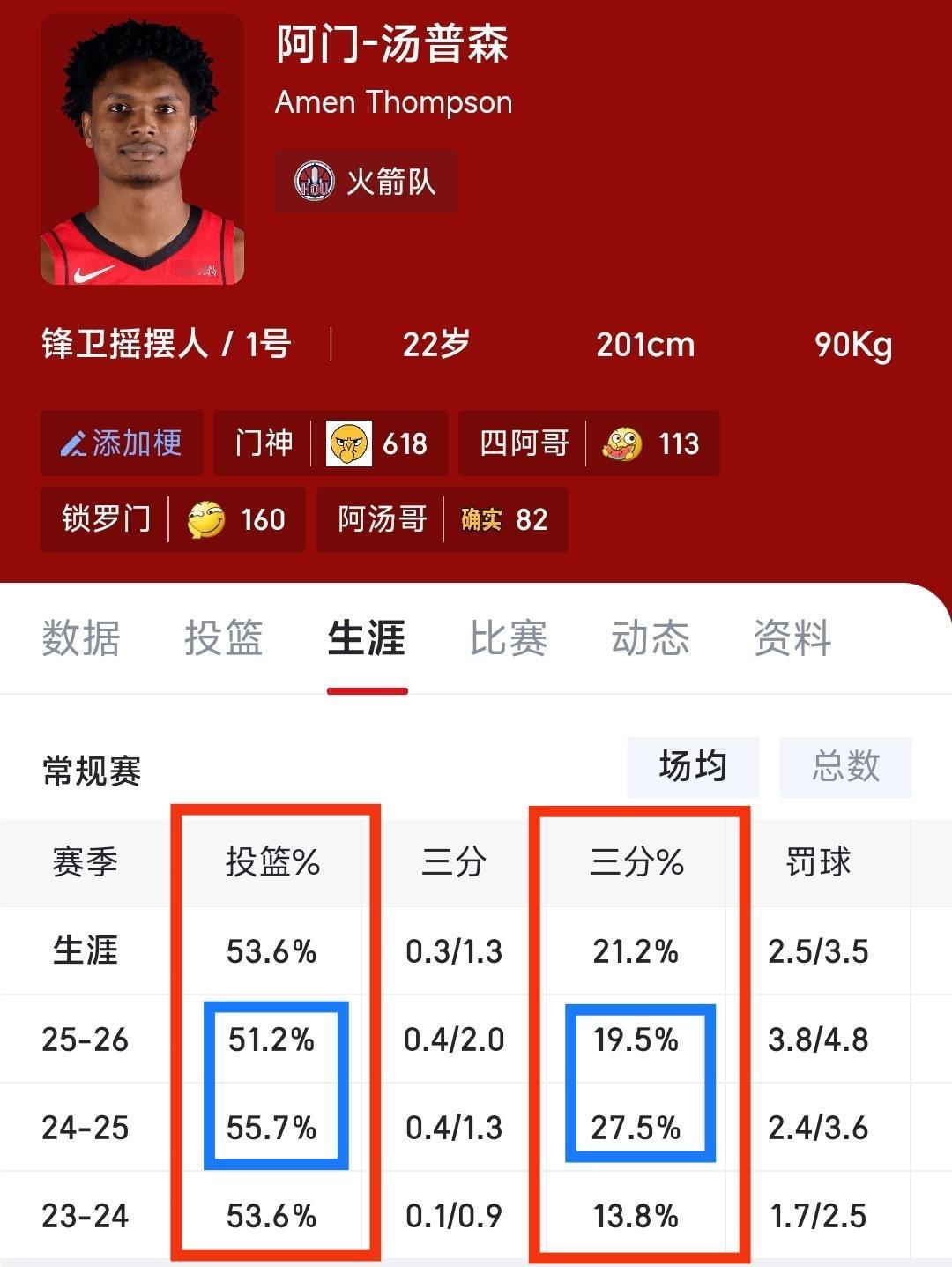 我有点想不通,阿门汤普森这赛季罚球命中率已经来到了79%,比上赛季提升了11%,那怎么投篮就是练不出来呢,如果能有投篮,阿门绝对能拿顶薪做基石啊。 可实际上是阿门的投篮和三分这赛季跟上赛季比,都有不同程度的下滑,尤其是三分跌了8%,真是让人费解,难道是范乔丹受伤的原因吗?