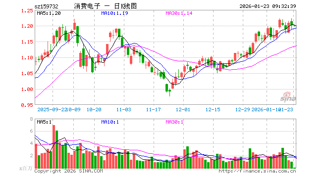 1月23日,消费电子ETF(159732)开盘涨0.08%,报1.201元。消费电子ETF(159732)重仓股方面,立讯精密开盘涨0.39%,胜宏科技跌0.29%,京东方A涨0.23%,兆易创新跌1.81%,东山精密跌0.26%,豪威集团涨0.01%,TCL科技跌0.20%,歌尔股份涨0.52%,蓝思科技涨0.24%,三环集团涨0.11%。