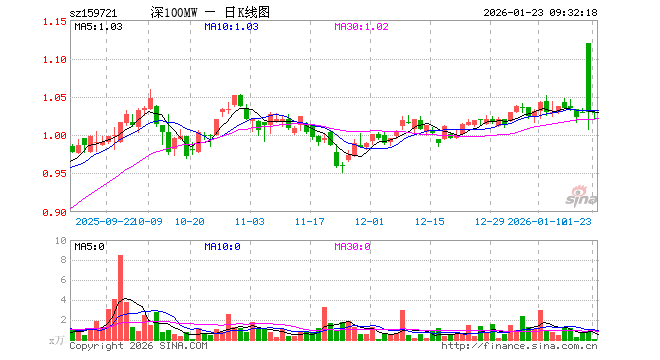 1月23日,深证100ETF永赢(159721)开盘涨0.00%,报1.030元。深证100ETF永赢(159721)重仓股方面,宁德时代开盘涨0.64%,中际旭创跌1.13%,新易盛跌0.94%,美的集团涨0.10%,东方财富涨0.21%,立讯精密涨0.39%,阳光电源涨0.38%,比亚迪涨0.13%,五粮液涨0.04%,胜宏科技跌0.29%。