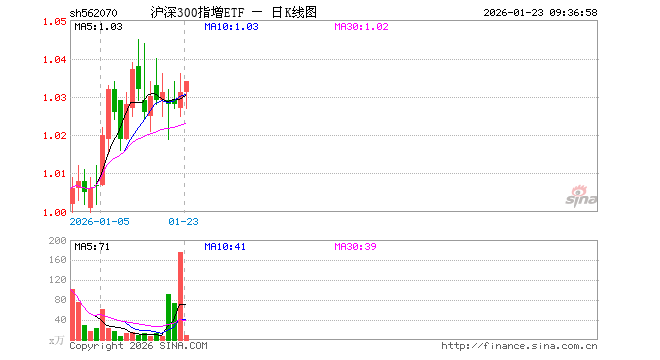 1月23日,沪深300指增ETF(562070)开盘涨0.00%,报1.031元。沪深300指增ETF(562070)重仓股方面,宁德时代开盘涨0.64%,贵州茅台涨0.00%,中国平安涨0.62%,紫金矿业涨1.94%,招商银行涨0.00%,兴业银行涨0.10%,中际旭创跌1.13%,新易盛跌0.94%,寒武纪跌1.18%,药明康德涨0.42%。