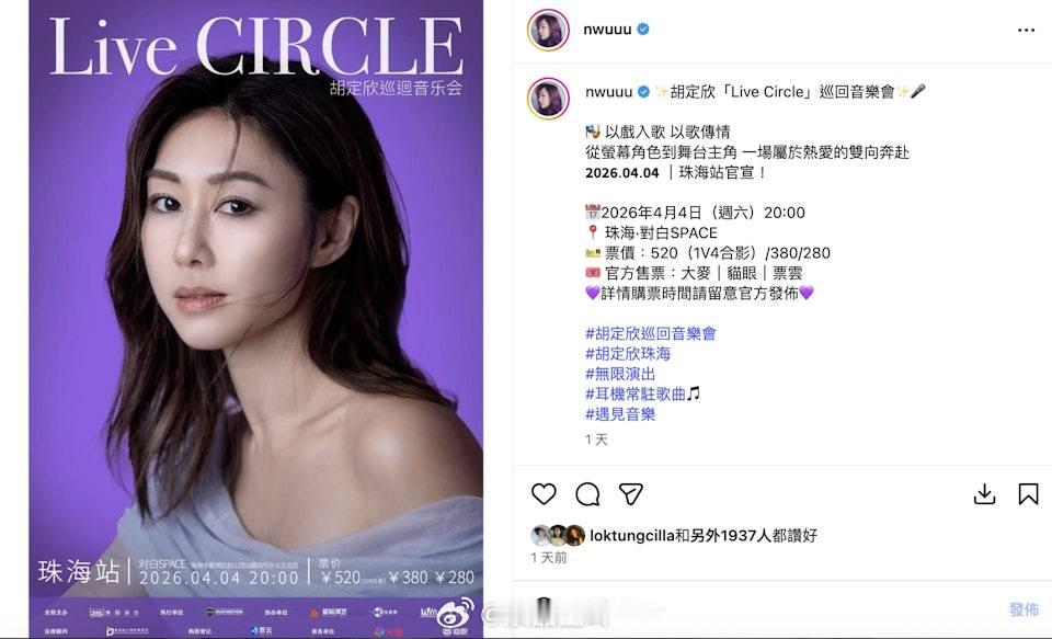 TVB視后兩年冇劇開搞巡迴音樂會票價勁抵 最貴飛520仲可以合照視后胡定欣上年無預警下宣布結婚,震驚不少人,更令人震驚的是,貴為兩屆視后的她,竟然已經有兩年無劇開。雖然未有劇集開工,但胡定欣的工作步伐並沒有停下來,正在為自己的巡迴音樂會努力不懈。視后胡定欣上年無預警下宣布與外科醫生男友陳健華結婚。(IGCircle巡迴音樂會》東莞站。(小紅書)胡定欣上年3月的《胡定欣Live Circle巡迴音樂會》東莞站。(小紅書)胡定欣新婚豪宅曝光 親手佈置2米巨型聖誕樹客廳闊落盡顯奢華胡定欣音樂會最貴飛520仲可以合照。最近,胡定欣在社交平台為自己2026年4月4日的《胡定欣Live Circle巡迴音樂會》珠海站做宣傳,見到票價非常親民,分別為人民幣520/380/280,而買最貴飛520的觀眾,更可以有一張1V4合影。這個價錢可以近距離觀看偶像演出,又可以與偶像合照,對粉絲來說絕對值回票價。《胡定欣Live Circle巡迴音樂會》珠海站宣傳海報。(IGCircle巡迴音樂會》珠海站做宣傳。(IG馬來西亞星光薈萃頒獎典禮2016》以及《萬千星輝頒獎典禮2016》三地的視后,完成大滿貫。她於《萬千星輝頒獎典禮2016》所奪得的視后,更為成為繼2010年鄧萃雯之後史上第二位女藝人蟬聯視后寶座。陳展鵬和胡定欣拍《城寨英雄》和《同盟》時傳緋聞。(資料圖片/林通賢攝)