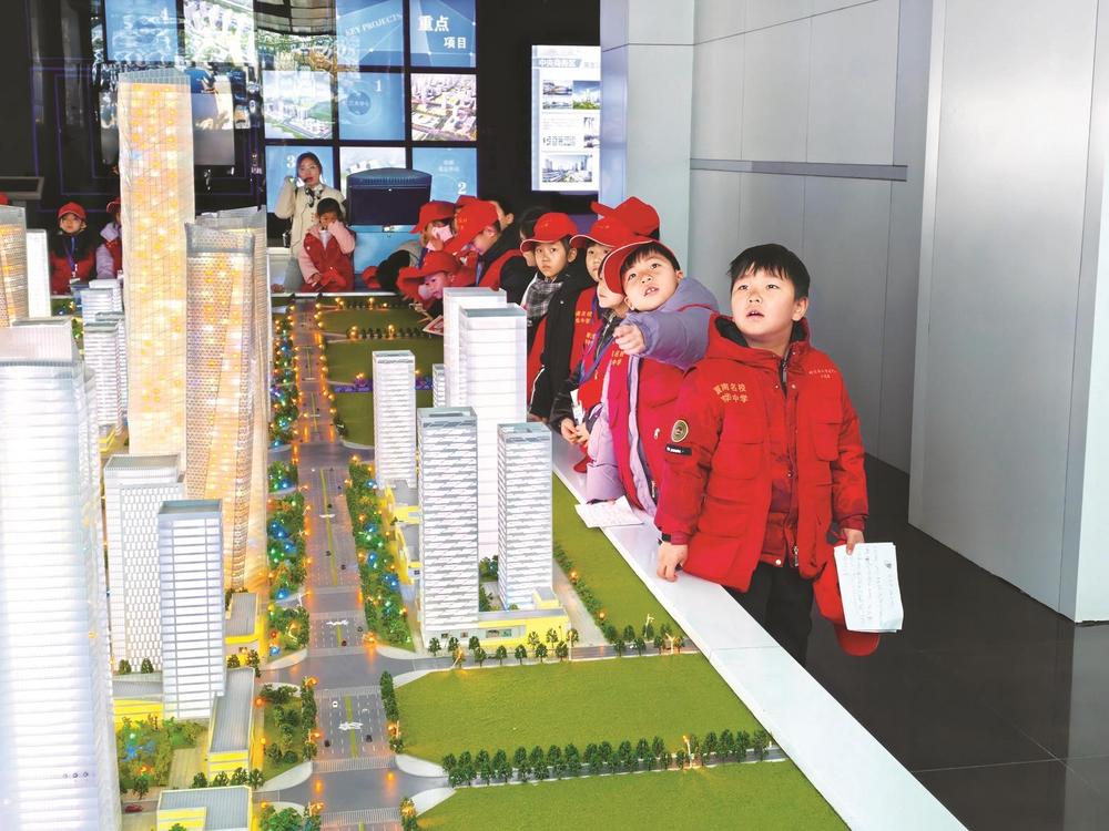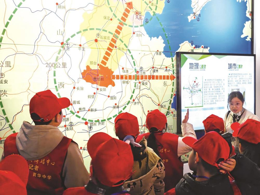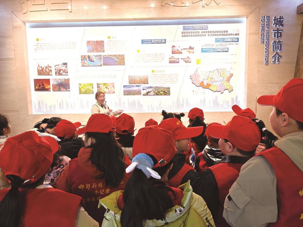 随后,小记者们来到城市概览与建设成就展区。在这里,孩子们通过详实的图文资料和数据展板,系统了解了邯郸的地理位置、行政区划和人口分布。“邯郸市位于河北省南端,西依太行山脉,东接华北平原,与晋、鲁、豫三省接壤,全市总面积1.2万多平方公里,常住人口900多万。”讲解员细致的解说让小记者们对家乡有了更全面的认知。在建设成就展区内,从早期城市规划到如今的发展成果,一幅幅对比鲜明的图片、一个个详实的建设数据,让大家真切感受到了邯郸近年来的快速发展。当看到沙盘上熟悉的学校、公园和街道时,小记者们顿时兴奋地指点交流,现场气氛十分热烈。