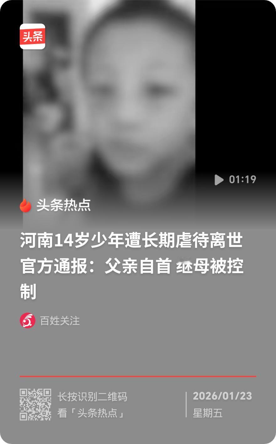 痛心!河南14岁男孩遭生父继母虐待离世,临终哀求“给我倒杯水” 河南安阳14岁男孩张砷(化名)的悲剧,让无数人揪心!2025年中秋节,这个本该在校园嬉闹的少年不幸离世,临终前向继母发出的“给我倒杯水喝”的微弱哀求,成了他留在世上的最后声音。 据悉,张砷半岁时母亲离家失联,生父常年跑货运,他从小跟着奶奶、姑姑长大,曾是个活泼懂事、眼里有光的孩子。2021年,生父再婚后续将9岁的他接回身边,谁料这竟是噩梦的开始。姑姑曾偶遇他脸上带瘀青,后来孩子逃到姑姑家时,全身的伤痕更是触目惊心——胳膊红肿发紫、后背满是淤青、脊椎有条状伤痕。 姑姑多次要求抚养孩子遭拒,推测生父是为了奶奶给孩子的经济支持。之后生父禁止孩子与亲友接触,还不让他上学。2025年11月,姑姑才得知侄子早已离世,尸检报告显示,14岁的张砷身高仅1.4米,存在肝坏死、肺出血、脑出血等多处损伤,已达败血症状态,死前长期饥饿,肋骨凸起如骷髅,还穿着尿不湿。 目前生父已被逮捕并包揽全部罪责,继母却正常生活,姑姑强烈要求严惩施暴者。社区透露家长曾称“管教失手”,警方已定为刑事案件,记者联系当地公安和宣传部,分别得到“不接受采访”和“将核实”的回应。 这起悲剧敲响了未成年人保护的警钟,希望相关部门彻查到底,让施暴者付出应有代价,也愿这样的惨剧不再发生。虐待继女致死案 女童虐待致死案 14岁男孩之死
