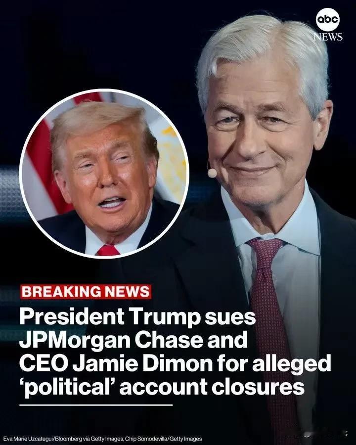 特朗普已起诉摩根大通及其首席执行官杰米·戴蒙,索赔50亿美元,指控该银行出于“政