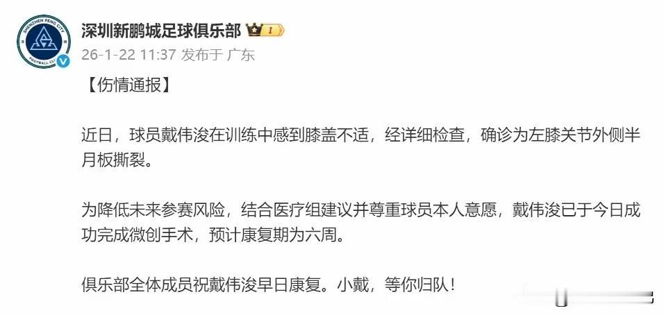 戴伟浚再次受伤,申花跳坑,深圳成接盘侠,苦的却是球员本人 近日,深圳新鹏城传出消息,新援戴伟浚再次遭遇伤病。 依然是膝盖、依然是赛季准备期,不同的仅仅是时间。 伤缺六周,对于戴伟浚而言,属于不幸中的万幸。 至少不用像上赛季那样,整整一年做壁上观,毫无用武之地。 申花听到这个消息,恐怕内心窃喜,差一点点,总算是避坑了。 而深圳队必然郁闷无比,作为中场一笔重要引援,比赛没踢怎么又伤了? 24-25赛季深圳队曾让申花吃尽苦头,没想到这回成了接盘侠。 当然,最难受是球员本人,也不知犯了啥天条,居然连续两年受伤,太背了。 这伤来得太不是时候,在申花踢不上球的戴伟浚急需证明自己,结果…… 错过准备期成必然,可问题远不止这些。 能否顺利康复? 能否恢复状态?恢复到何种程度? 受伤期间球队会如何调整,复出后还有没有位置? 由于频繁伤病,球员心理必定会遭受巨大压力,能不能顶住? 这一系列问题都需要解决,因此戴伟浚未来的路不好走。 类似阿马杜,重伤后再也无法达到曾经的水平,只能被球队淘汰。 这种遭遇,对球员和球队而言都是损失。 从去年初重伤后,戴伟浚就没怎么踢过正式比赛,情况如何谁也不清楚。 深圳队愿意签下他,多少有些冒险,恐怕也是想搏一搏他当年的能力。 结果确实不走运,典型出师未捷。 如今的戴伟浚成玻璃人,动不动就伤,竞技状态怕是难以保证。 估摸着未来很难再确保主力位置,这真不是危言耸听。 一方面球队在使用他时会谨慎,谁能确保没下次? 另一方面,球员本身也会患得患失,场上不敢做动作,不敢发力。 接二连三的伤病肯定会让他有所保留,无法全力去拼。 这并非球员态度问题,而是心理压力带来的后遗症。 当年意气风发地国家队主力,如今沦为这般地步,实在令人唏嘘。 老实说,留给戴伟浚的机会不多了,这几年始终在消耗曾经积累下的人气,如此下去终有一天会彻底出局。 深圳几乎成了最后的救赎,触底反弹是唯一选项。 希望小戴早日康复,更重要的是能克服伤病带来的心理阴影,重新振作起来。 最后,也希望未来他能走好运,尽可能远离伤病。