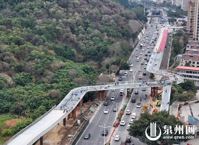 泉州网1月23日讯(融媒体记者张晓明张九强文/图)1月20日23时起至1月21日5时止,因中心市区坪山路北段快捷化改造工程建设需要,坪山路北段主道进行全封闭施工,引发市民关注。昨日,记者从市城管部门获悉,经过施工方夜间作业,作为改造工程之一的人行天桥完成跨坪山路主道吊装,全长1100米的慢行系统完成全部吊装施工。施工方表示,人行天桥力争春节前贯通,向市民开放。