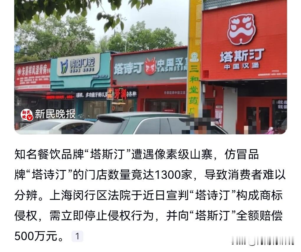这真是太无法无天了吧,太嚣张了。 1月23日热搜,知名餐饮品牌山寨店竟达1300家。 塔斯汀那是知名品牌。 想不到有一个山寨的塔诗汀擦边塔斯汀。 离谱的是,这样的山寨门店竟然高达1300家。 已经形成了很大的规模。 欺骗那些加盟商说和塔斯汀有关系,那些人误以为真,所以很多人加盟塔诗汀。 更离谱的是很多山寨门店,竟然故意选择开在塔斯汀的隔壁或者是对面。