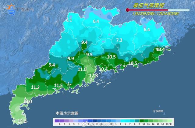 23日,广东大部多云到晴天。最低气温:粤北市县2~6℃,高海拔山区-2~2℃,有冰(霜)冻,粤西市县11~16℃,其余市县7~11℃。