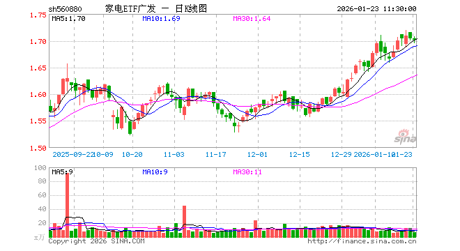 1月23日,截止午间收盘,家电ETF广发(560880)跌0.18%,报1.701元,成交额1179.95万元。家电ETF广发(560880)重仓股方面,格力电器截止午盘跌0.85%,美的集团跌0.63%,三花智控跌3.55%,海尔智家跌0.50%,麦格米特涨4.45%,四川长虹跌1.21%,石头科技涨0.47%,海信视像涨1.19%,科沃斯跌0.32%,兆驰股份涨3.93%。
