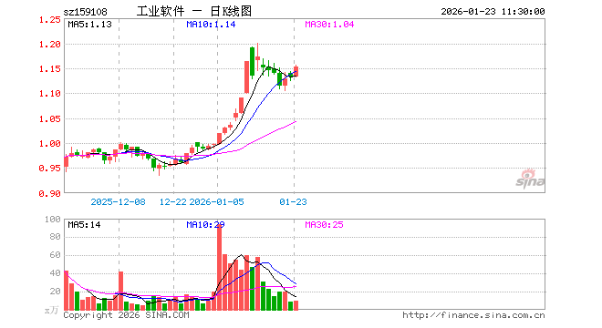 1月23日,截止午间收盘,工业软件ETF(159108)涨1.77%,报1.153元,成交额1115.53万元。工业软件ETF(159108)重仓股方面,华大九天截止午盘跌0.54%,广联达涨0.88%,汇川技术涨0.62%,东土科技涨1.62%,中控技术涨4.17%,旋极信息涨8.10%,用友网络涨2.29%,中颖电子跌0.28%,国电南瑞涨0.91%,中望软件涨1.56%。