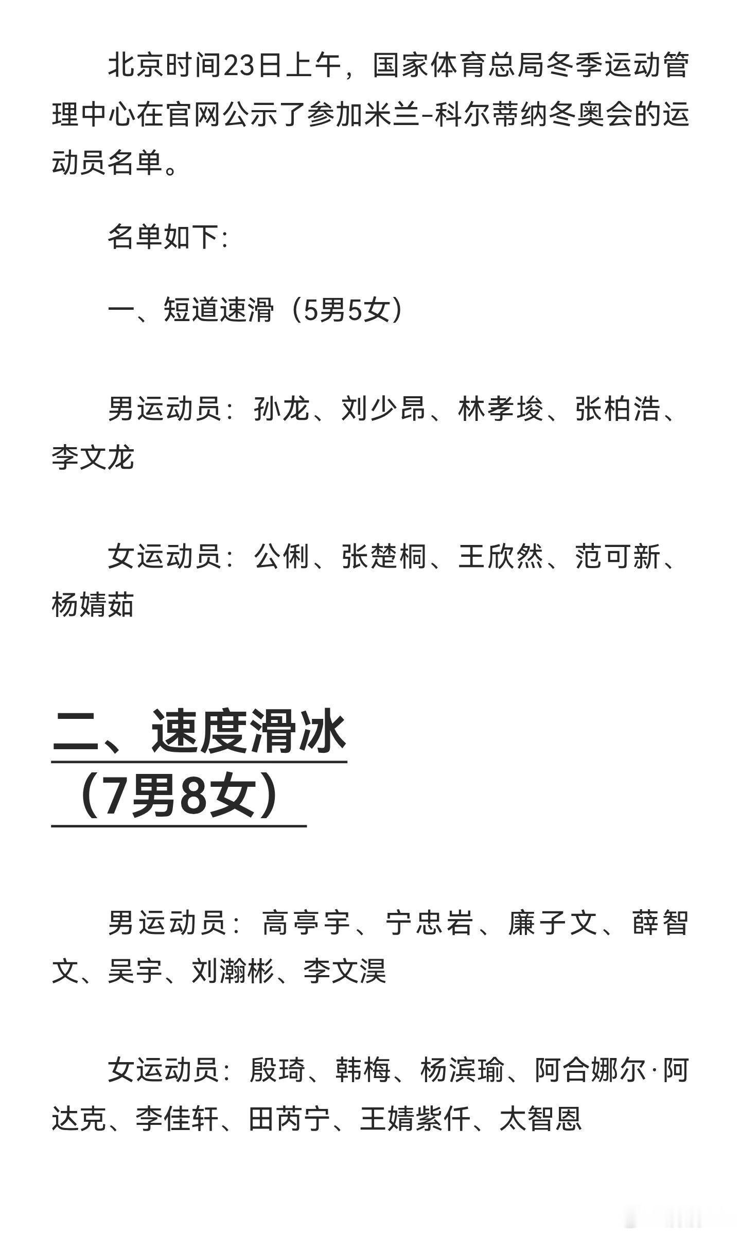 米兰冬奥运动员公示官宣!北京时间1月23日,米兰冬奥会中国参赛运动员名单正式公示,124名冰雪健儿集结完毕,覆盖8大项20分项全阵容出击!林孝埈、谷爱凌、徐梦桃、隋文静/韩聪等名将领衔,老带新阵容兼具实力与活力,短道速滑、自由式滑雪等优势项目蓄势冲金,车橇等项目全力冲击历史突破。中国冰雪军团整装待发,期待他们取得好成绩,一起为健儿们加油!💪