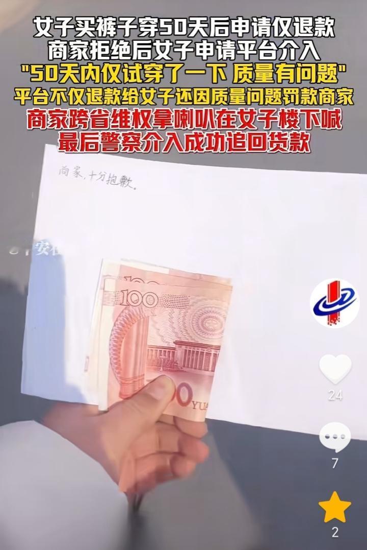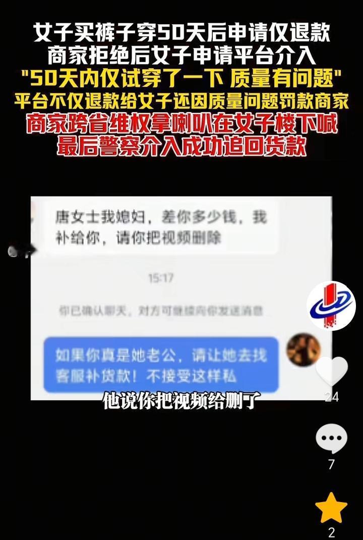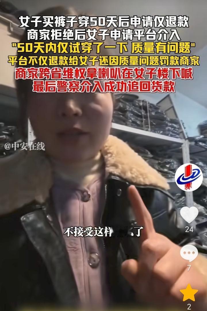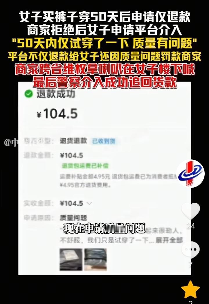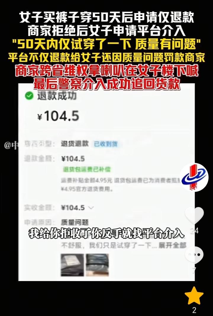 不惯着!浙江湖州,女子花费104.5元买裤子穿50天后申请质量问题要求退款,商家拒绝后,女子直接找平台介入,现在不仅平台给退了款,而且还因质量问题罚款商家6元钱,商家视频发布后,一位自称女子老公的人要求商家删除视频,然后给赔偿货款,商家没有同意而是让女子去找平台客服补货款,不接受私了,双方没谈妥,而后商家直接跨省维权,用喇叭在女子楼下喊,最后警方介入成功追回货款。 都穿了50多天了,还想着让退款,不知道怎么好意思的,不过我也是挺佩服这个商家的,为了一百多元不仅耗费精力,而且还跨省去维权,虽然这次商家的花费比货款多,但是商家这种做法很解气,主打一个不惯着,如果商家选择忍气吞声,那么无疑就是纵容了女子。 人与人之间应该相互理解,作为商家做生意也不容易,如果真的质量有问题,女子收到货试穿后一发现就应该申请退款退货,结果穿了50多天,然后申请退款明显就是有想白嫖的嫌疑。