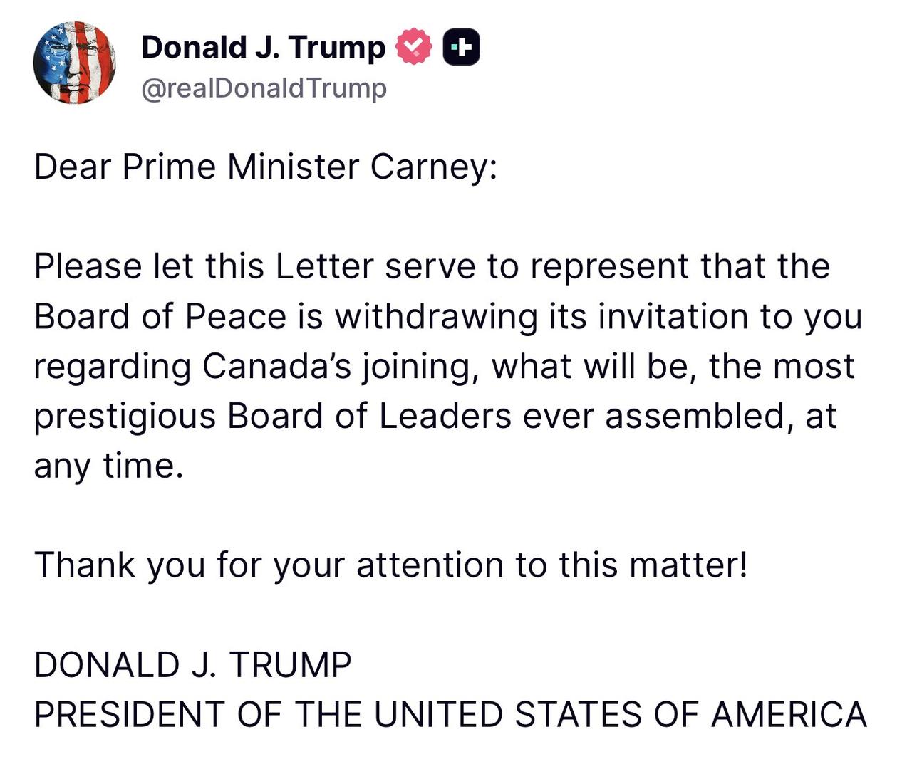特朗普发帖,撤回了此前向加拿大总理卡尼发出的加入“和平委员会”的邀请。