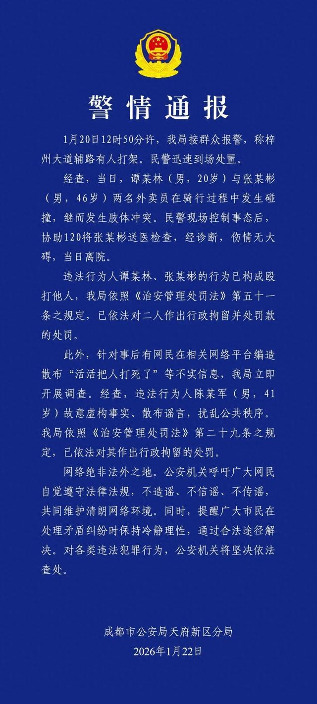 两名外卖员打架,一网民趁机编造、散布谣言,三人均被行政拘留!1月22日晚,成都市公安局天府新区分局发布警情通报: