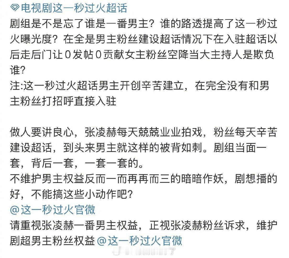 《这一秒过火》男主张凌赫粉丝在维权,要求王楚然粉丝卸任超话主持人。