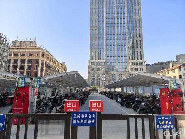 与“95号地块”一条马路之隔,是一个新开辟的非机动车停车场。600多平方米,能容纳500辆左右非机动车停放,还配有250个电瓶车充电桩。这个非机动车停车场24小时开放,配有保安值守,电瓶车充满自动断电装置、烟雾报警器、喷淋器等安全设施一应俱全。