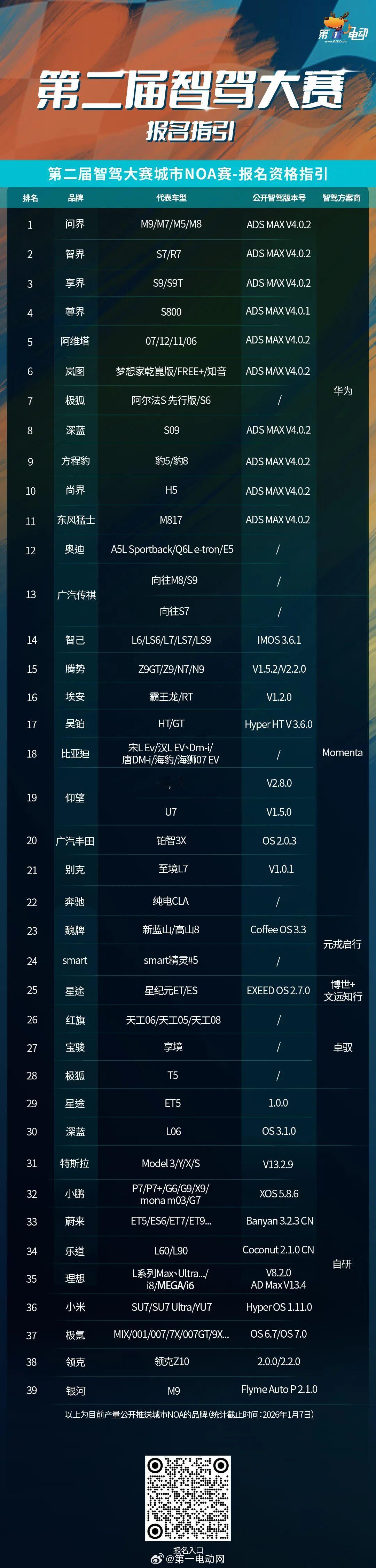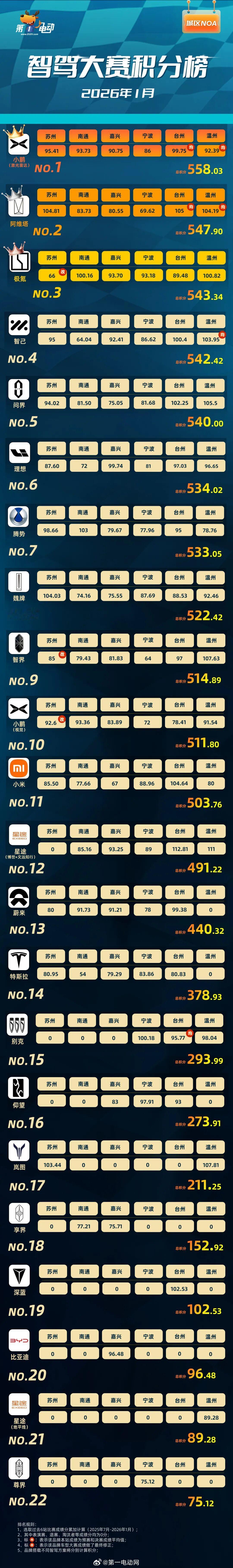 第二届中国智驾大赛中国智驾战力天梯榜 【极氪千里浩瀚杀入前三】台州硝烟未散,温州战火又燃。随着“取最近6站成绩”规则持续生效,积分榜格局再次剧烈洗牌。中游品牌强势冲击,头部阵营攻防激烈,见证着中国智驾竞争的炽热与残酷。🏆 2026年1月积分总榜核心看点榜首易主:小鹏(激光雷达方案) 以558.03分夺回榜首,阿维塔以547.90分退居第二。最大黑马:极氪(千里浩瀚方案) 积分大涨39分,排名飙升7位,历史性杀入三甲,总分543.34分。剧烈滑落:蔚来因缺席温州站赛事,排名下降10位,跌至第13名。期待后续比赛快速追上📜 2026年1月积分总榜(按总积分排序)第一名 小鹏(激光雷达方案)|总积分 558.03温州站均分92.39分,剔除早期低分后,凭借近期稳定发挥重返第一。第二名 阿维塔(华为ADS方案)|总积分 547.90温州站均分高达104.19分,但受规则剔除无锡站110.89分影响,憾失头名。第三名 极氪(千里浩瀚方案)|总积分 543.34最大进步奖得主!剔除无锡站61.68分历史低分,新增温州站100.82高分,成功逆袭。第四名 智己(Momenta方案)|总积分 542.42排名上升3位,温州站均分103.95分,呈现稳健上升态势。第五名 问界(华为ADS方案)|总积分 540.00华系内战中保持强势,温州站预赛105.5分。第六名 理想|总积分 534.02排名上升2位,温州站96.65分,近期表现趋于稳定。第七名 腾势(Momenta方案)|总积分 533.05排名略有下滑,温州站78.76分,状态出现波动。第八名 魏牌(元戎启行等方案)|总积分 522.42温州站92.46分,但受规则剔除早期高分影响,排名有所调整。第九名 智界(华为ADS方案)|总积分 514.89排名不变,温州站预赛107.63分,表现亮眼但受总场次成绩牵制。第十名 小鹏(视觉方案)|总积分 511.80排名上升1位,温州站预赛91.54分。第十一名至第二十二名11 小米|总积分 503.76(温州站80分)12 星途(博世+文远知行方案)|总积分 491.22(温州站111分,单站王者)13 蔚来|总积分 440.32(缺席温州站致排名变化比较大)14 特斯拉|总积分 378.93(缺席温州站,FSD一直更新停滞)15 别克|总积分 293.99(参赛3站,均分高达98分)16 仰望|总积分 273.9117 岚图|总积分 211.25(温州站预赛107.81分)18 享界|总积分 152.9219 深蓝|总积分 102.5320 比亚迪|总积分 96.4821 星途(地平线HSD方案)|总积分 89.28(首秀温州站)22 尊界|总积分 75.12📈 格局深度解读规则即战场:“最近6站”规则放大近期表现权重,让持续迭代者快速上位(如极氪)。单站高分刺客:星途(博世+文远知行)、别克等品牌虽参赛场次少,但单站平均分(98.24分、98分)高居榜首,随时可能搅动格局。技术路线百花齐放:前十名中华为ADS、小鹏自研、Momenta、千里浩瀚、元戎启行等多条路线并存,实战检验进入多元化深水区。🗳️ 互动话题:下一站金华(3月底开赛),你认为谁的排名还会发生剧变?🔜 下一站·金华见3月见浙江赛段收官之战即将到来,战火未熄,格局未定。欢迎所有城区NOA智驾里程超5000公里的真实车主,附上报名索引(图三)扫描海报二维码,驶入下一场真实路况的较量。数据来源:第二届中国智驾大赛2026年1月积分榜:网页链接制图支持:👇 点击关注,与我们共同见证每一站的每一次智驾进化智驾积分风云录每一站都是新序章智能驾驶
