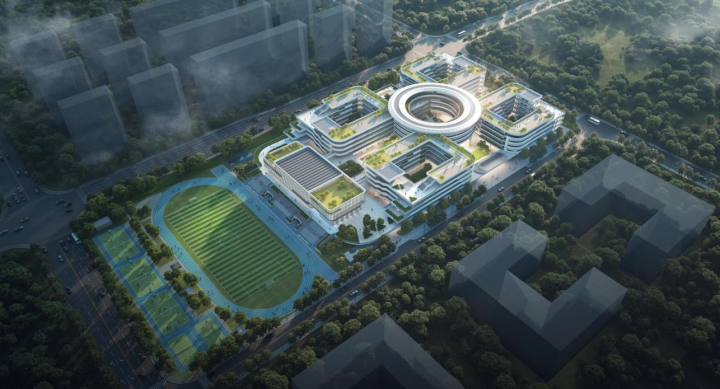 设计上,校园以杭州市花“桂花”为灵感,采取“一环双轴五组团”的布局。通过一条中心活力环和两条景观轴线,将东侧教学实验区等“静”的空间,与西侧运动生活区等“动”的场所分隔开来。