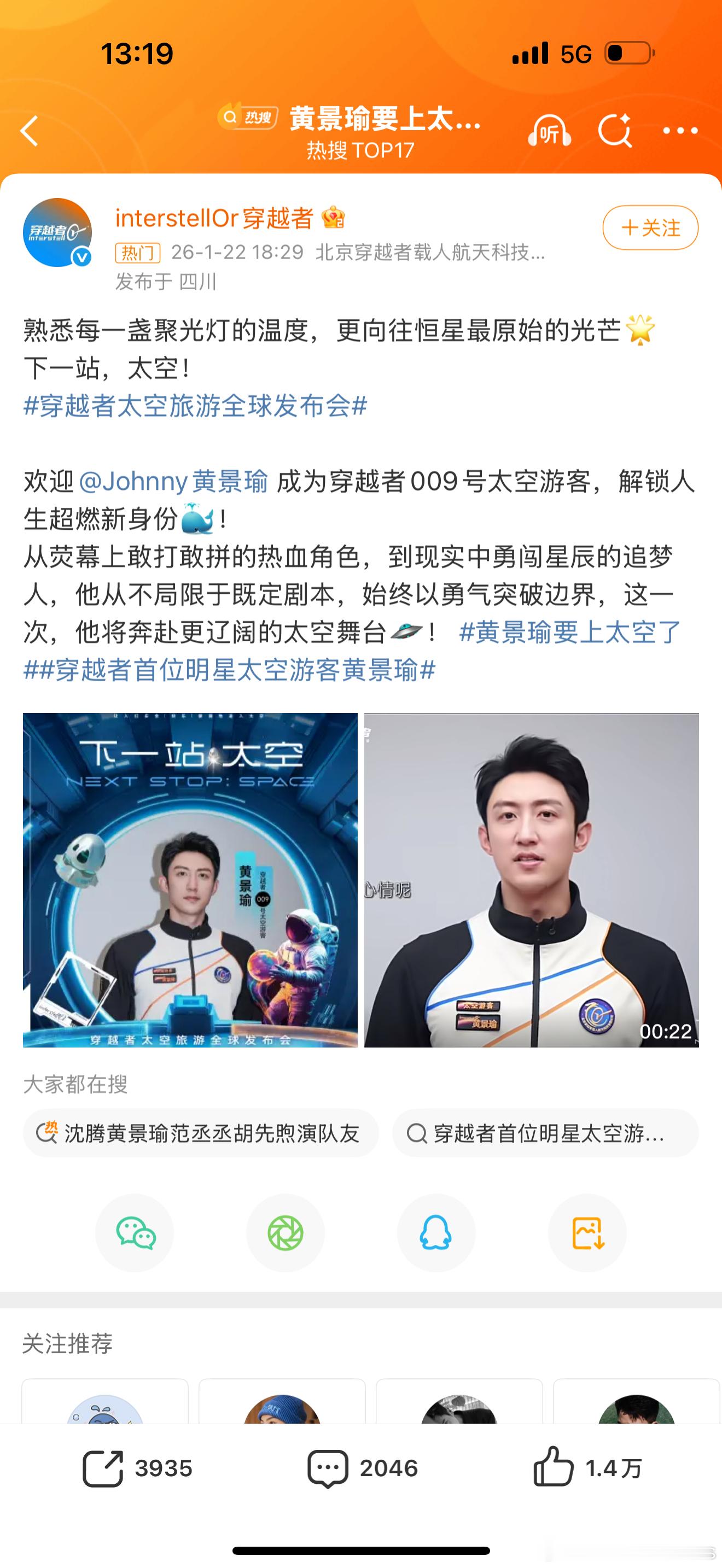 黄景瑜要上太空了演员黄景瑜将乘坐国内首艘商业载人飞船上太空,预售船票300万/张,预计2028年首飞。商业航天的发展真的太快了,准备提前做好航天知识储备以及原始资本积累,假以时日,车评干不动了,是不是可以进行商业航天评测?穿越者首位明星太空游客黄景瑜
