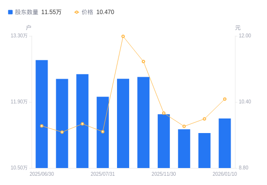 日期A股户数(户)流通A股户均持股数(股)户均持股市值(万元)2026-01-201137009201.4710.072026-01-101155009058.079.482025-12-311124009307.909.302025-12-191132009242.119.072025-11-301164009013.649.132025-10-101243008440.779.612025-09-301239218466.5810.152025-07-311201008735.958.462025-07-201249008400.228.292025-07-101239008468.028.19