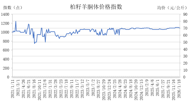 截至1月18日,羊胴体价格指数报1077.03点,较上期下跌1.41%,价格报70.0元/公斤,较上期下跌1.0元/公斤。