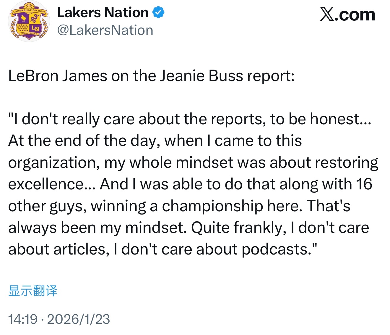 詹姆斯回应珍妮·巴斯的那篇报道:“说实话,我根本不在乎这些报道……归根结底,当我加入这个团队时,我的全部目标就是帮助球队重返巅峰。我和另外16位队友一起实现了这个目标,为湖人赢得了总冠军。这才是我始终关注的焦点。坦白说,我不在意媒体报道,也不关心播客内容。”