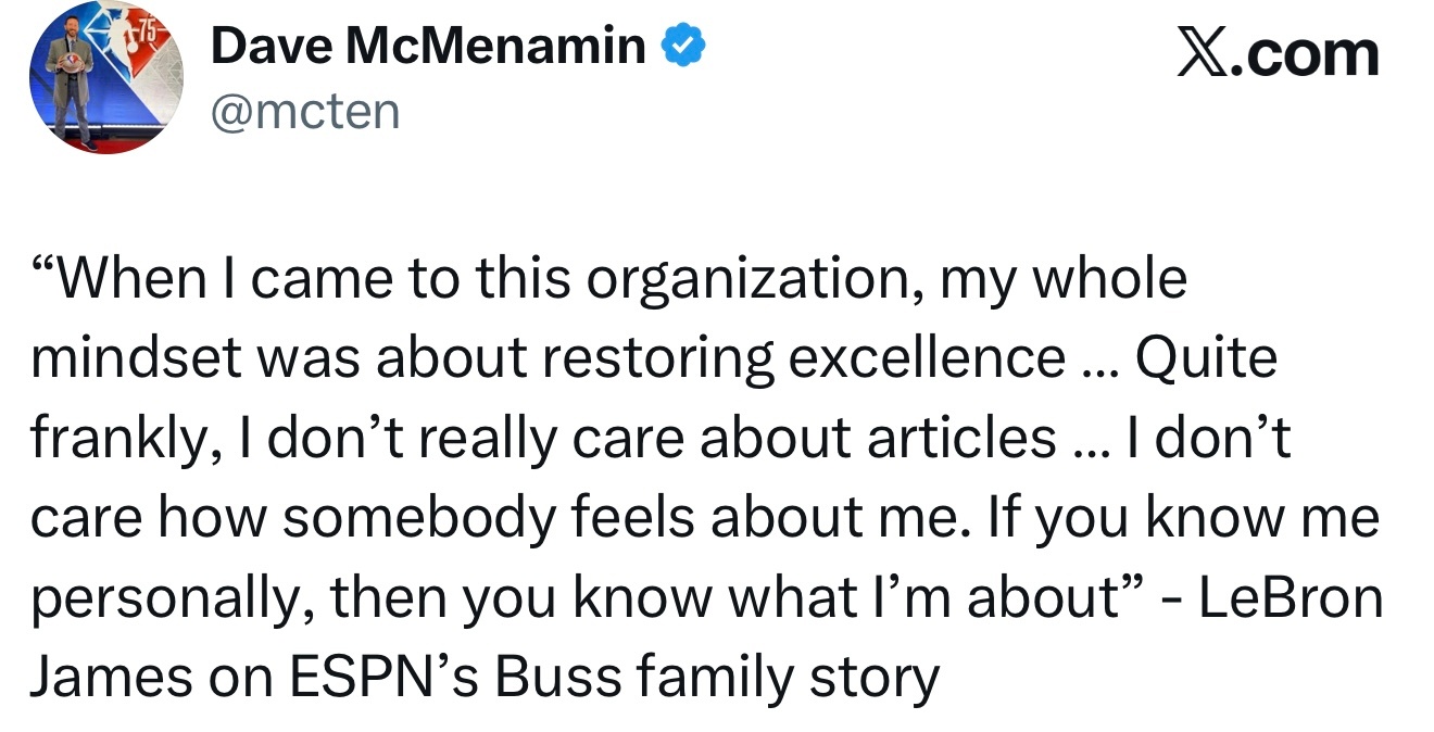 “我来到这支球队时,我的全部想法就是重振雄风……坦白说,我并不在意那些报道……我不在乎别人怎么看我。如果你认识我,你就知道我是什么样的人。”——詹姆斯谈ESPN关于巴斯家族故事的报道