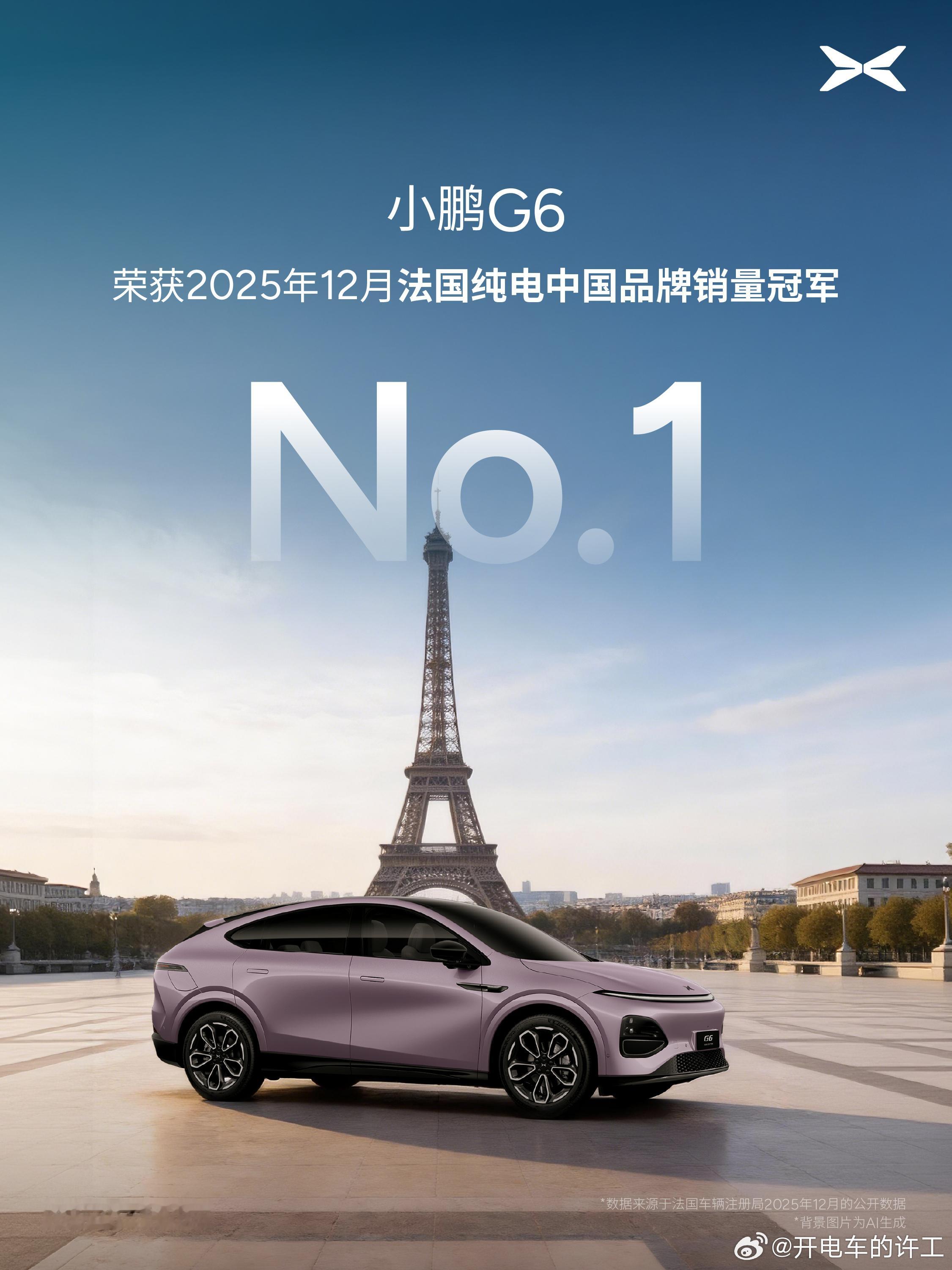 四张图带你看一下小鹏G6在欧洲有多火:-荣膺英国权威媒体“年度行政级汽车”大奖-2025年丹麦中国品牌销量冠军-2025年12月法国纯电中国品牌销量冠军-2025年德国中型纯电suv中国新势力品牌销量冠军随着2026款小鹏G6焕芯升级,全系标配图灵 AI 芯片,主打一个科技平权,不加价享智能升级体验。从欧洲到全球,小鹏G6正以扎实的产品力,持续向世界展现中国智能汽车的硬核实力。小鹏G6斩获德国中型纯电SUV年度销冠小鹏G6登顶法国12月纯电中国品牌销冠小鹏汽车新能源汽车小鹏汽车