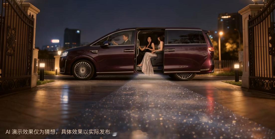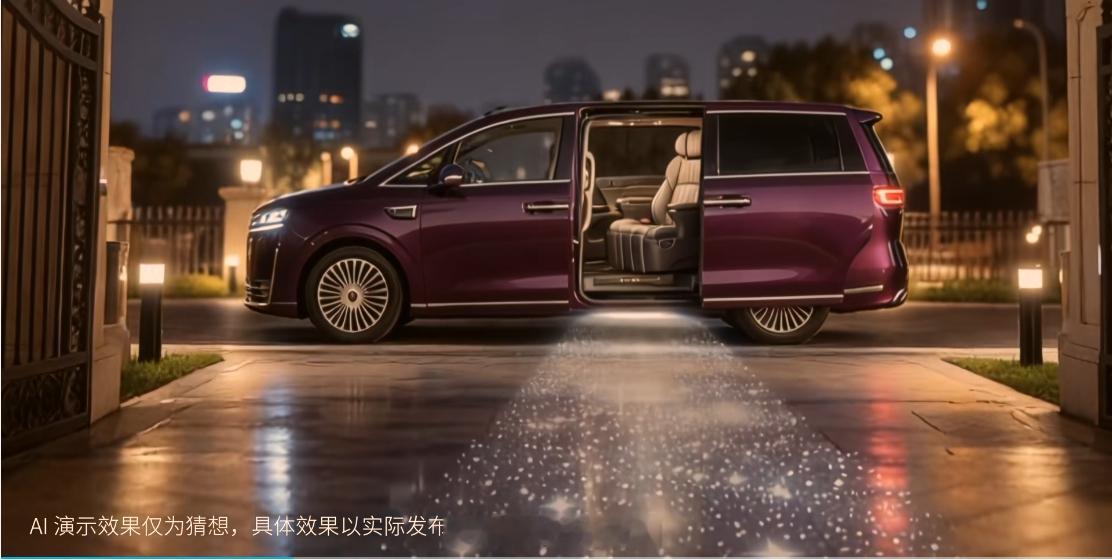有网友参考网上爆料的智界V9 或将搭载的侧向互动光毯,用AI给大家做了一个真实的效果展示,如果真的是这个效果,那这自带“红毯”的效果又要成为一大亮点 这情绪价值太到位了,估计会给MPV这个市场一次颠覆,没准儿还有模仿的