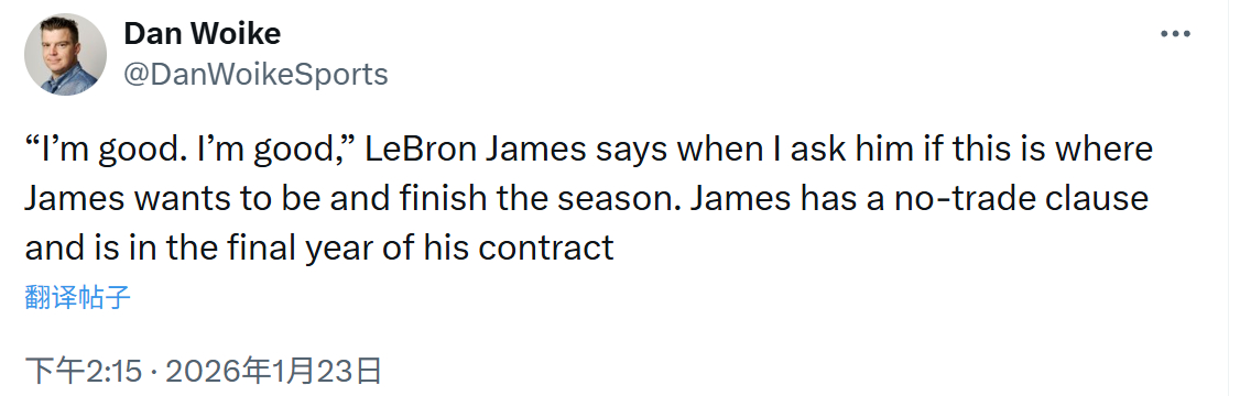 记者Dan Woike:当被问到是否想在湖人打完本赛季时,詹姆斯回答说:“我很好,没问题。”詹姆斯拥有交易否决权,并且正处于合同的最后一年。