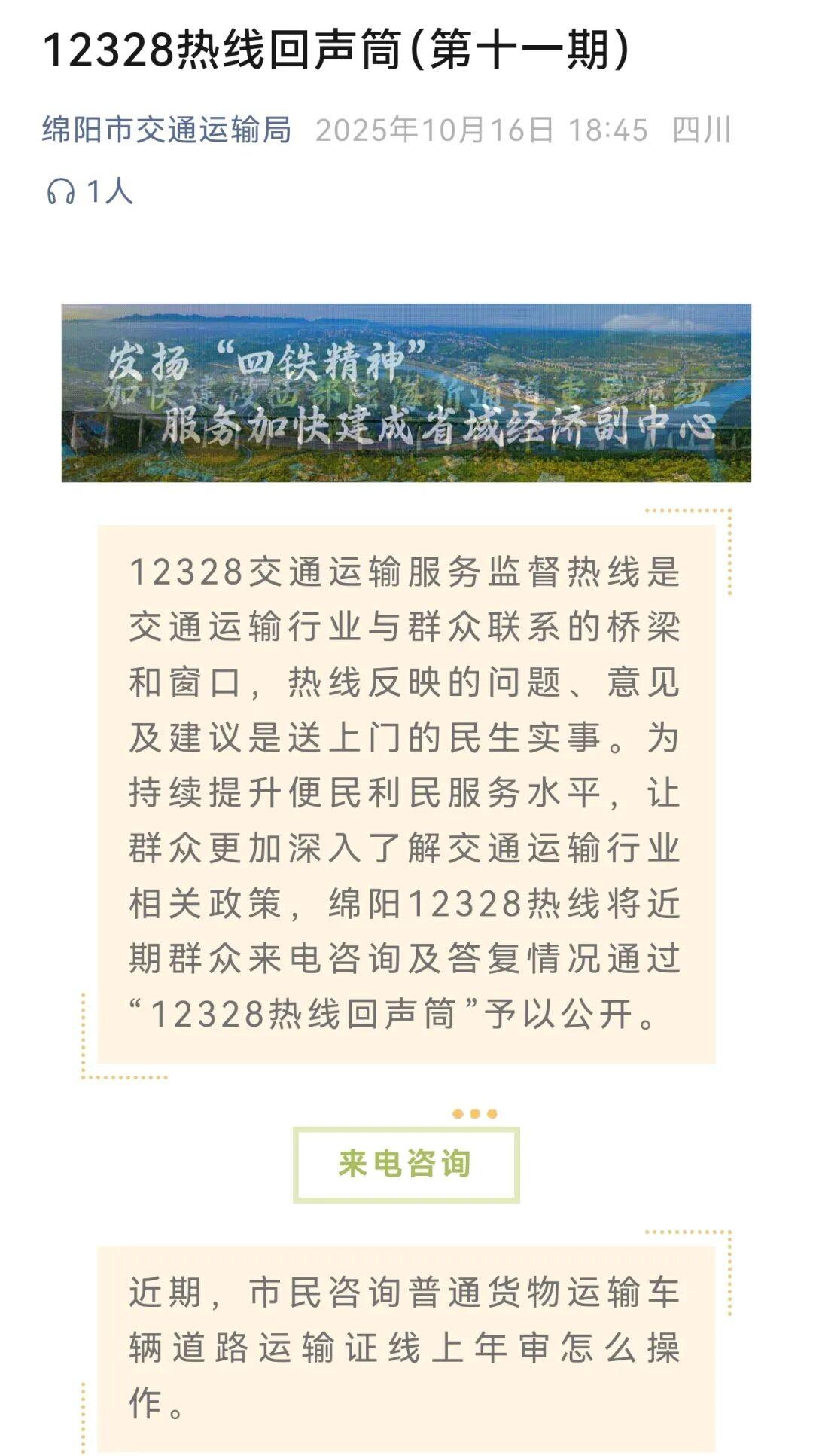 您的声音,我们倾听,您的出行,我们守护!绵阳12328热线将继续以“双提双解”为指引,以更快的响应、更实的举措、更暖的服务,陪伴您每一段行程,让交通服务更有温度,让群众出行更加顺心,如遇涉及交通运输相关问题,欢迎拨打12328热线,我们将竭诚为您服务!(绵阳市交通运输局)