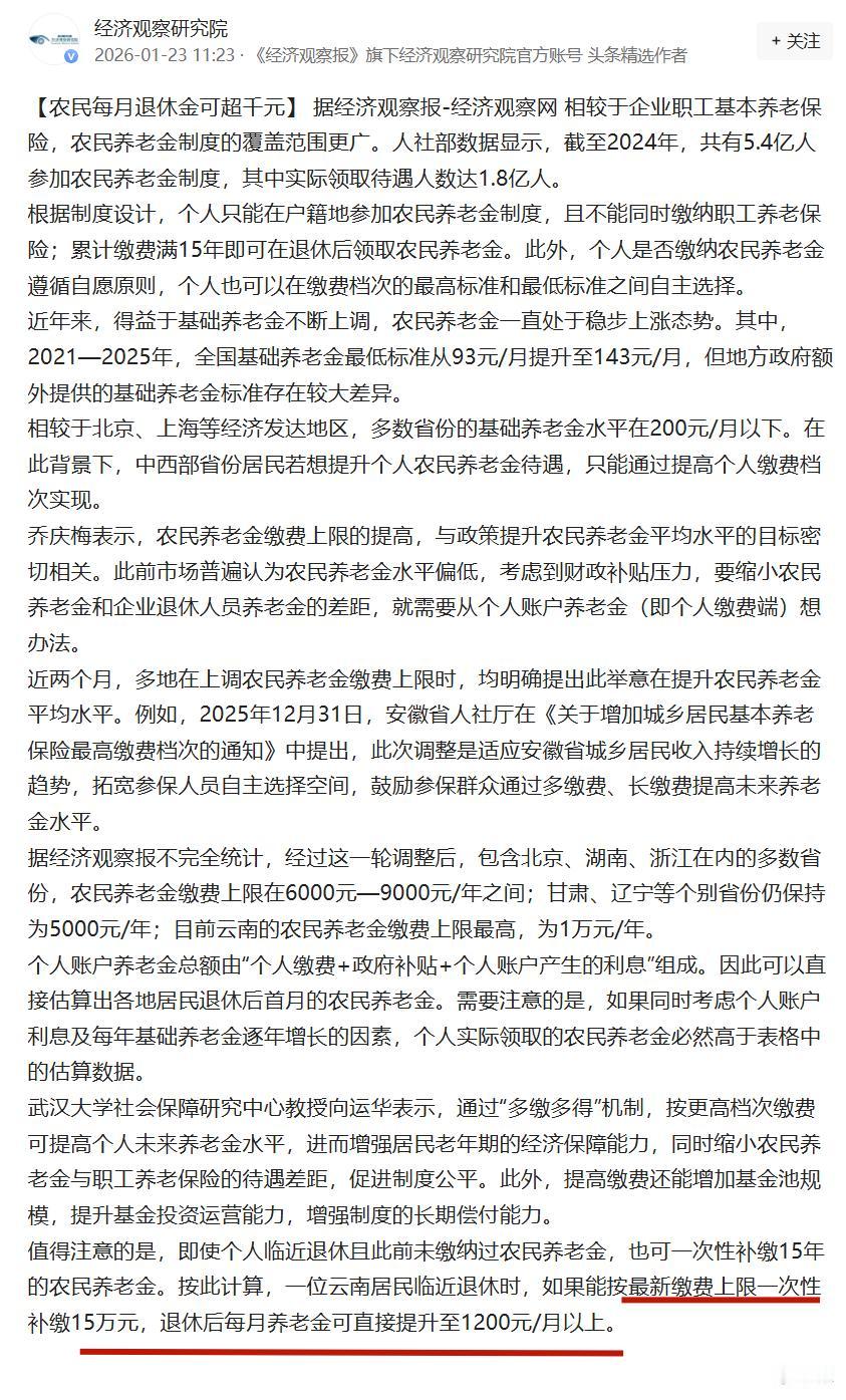 媒体说这个话,就是在讨骂。《经济观察报》旗下经济观察研究院官方账号发布信息称“农民每月退休金可超千元”。 看到这个标题,小编开始还很高兴。 看完之后才晓得,原来,只有临近退休时,按最新缴费上限一次性补缴15万元,退休后每月养老金才能直接提升至1200元/月以上。 这不就是标题党吗? 看到这个标题大家都以为是要提高农民的退休金。原来就是为了吸引眼球。 如果是一般的自媒体发布这样的消息也就罢了,权威媒体发布这样的信息真的不应该。 要知道,2025年全国农村居民人均可支配收入约2.5万元,这是国家统计局发布的数据。 这2.5万中,大约42%是农民打工的收入。15万意味着一位农民6年的收入。 对一个农村家庭来说,15万是一笔巨款。 交了这笔巨款之后,每月领1200元,一年也就是14400元。10年才能领回本。 有人会说,我都不晓得能不能活到那一天,你让我去交这么多钱。 听起来都很沉重。 权威媒体竟拿这样的事情博眼球,令人气愤。 小编在想,退休金是很严肃的问题,尤其是农民的。就我们这个地区而言,农民每月退休金约280元。高低我不敢评判。这是一个现实问题。 我看到有的专家开口就说,有很多原因导致这个结果。这呀那呀,说来说去,打到卡上的还是那么多。 既然涨不起,想必也有客观原因,好的一点是,每年涨一点点。 涨一点点也好啊。赚钱不容易,多一分钱也是钱。 所以,就不要把这件事拿出来虚拉期待,这样会伤害人的感情。