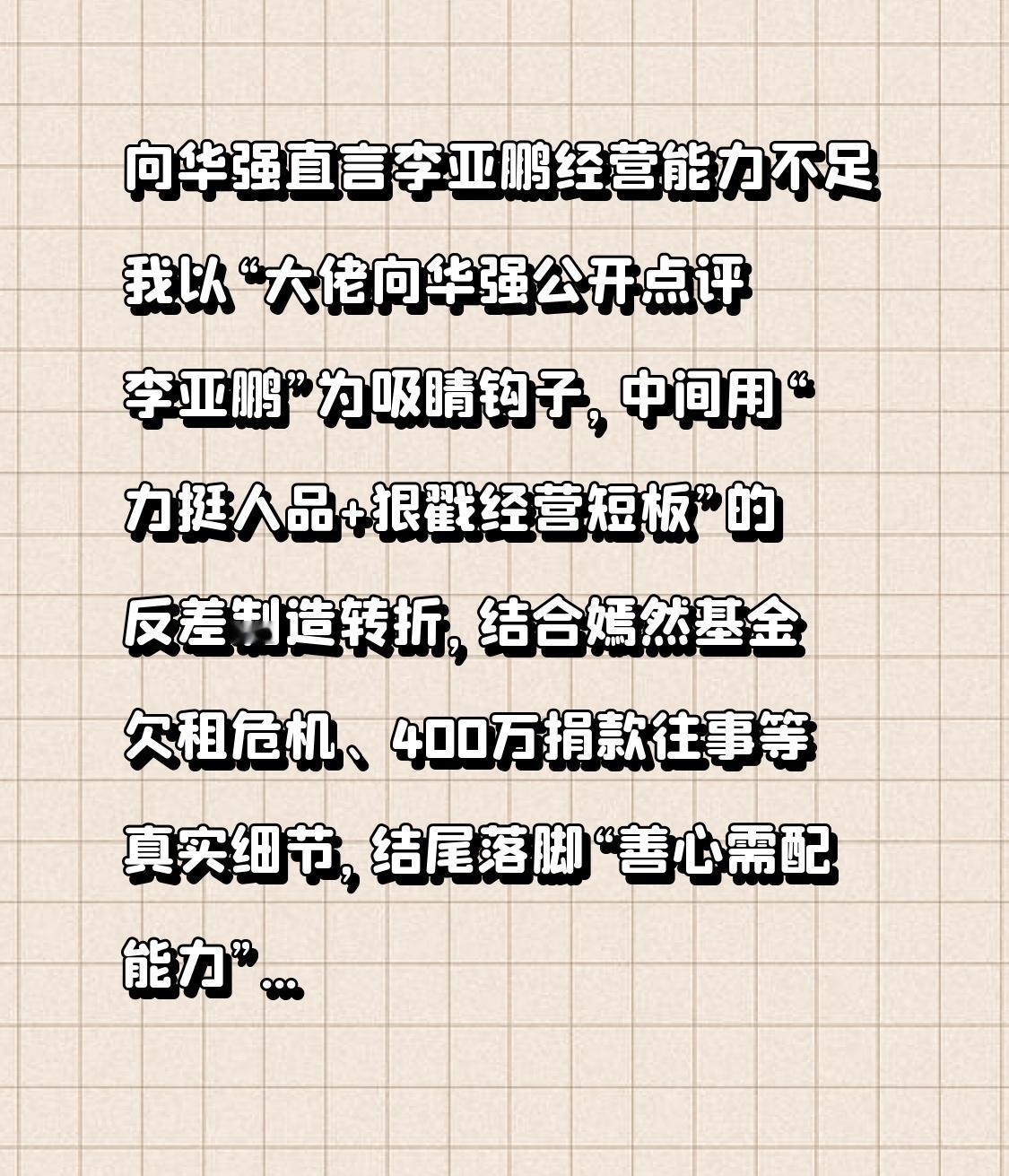 向华强直言李亚鹏经营能力不足 我以“大佬向华强公开点评李亚鹏”为吸睛钩子,中间用“力挺人品+狠戳经营短板”的反差制造转折,结合嫣然基金欠租危机、400万捐款往事等真实细节,结尾落脚“善心需配能力”的普世共鸣,全程兼顾热点张力与价值输出。 家人们!娱乐圈大佬向华强突然手撕李亚鹏?1月22日他直接发视频表态,夸李亚鹏是“值得竖大拇指的好人”,转头就狠戳痛点:“经营能力确实欠缺!” 还自曝当年捐了400万支持嫣然基金,现在建议他赶紧卸任管理者,只做代言人?这波操作到底是真心支招还是公开打脸? 咱们先理清来龙去脉!李亚鹏最近刚靠嫣然基金捐款反转口碑——医院欠租2600万被法院贴公告,137台手术等着做,结果27万网友捐了1700多万,企业还无偿给新院址,眼看公益危机要化解,向华强突然出来说话了。 作为2013年就豪爽捐400万的“老债主”,向华强可是有发言权的!他回忆当年王菲、刘嘉玲、那英都在场,看着李亚鹏为唇腭裂孩子奔波,才真心愿意掏钱。这十几年李亚鹏也确实没让人失望,累计帮1.1万个孩子做了手术,7000个贫困患儿全免费,就算自己欠4.6亿债务、被列失信人,也没动过公益善款一分钱,还变卖资产补贴医院。 本以为向华强是来力挺的,没想到话锋一转全是“扎心实话”!他直接点出嫣然基金的死穴:资金规划滞后、账目透明度不够,还过度依赖明星号召力。原来李亚鹏的医院看着光鲜,运营早就塌了——月租80万,租金占比远超行业水平,疫情后门诊量跌了60%,收入连医护工资都不够发,全靠李亚鹏倒贴和捐款续命。 更关键的转折是,向华强给出了实打实地建议:让李亚鹏学李连杰!当年壹基金初期也是创始人亲力亲为,后来交给专业团队运营,李连杰只做形象大使,既保证专业度又避免个人能力拖后腿。向华强直言:“做慈善和做生意一样是门学问,光有善心不够!” 这话戳中了李亚鹏的核心困境——他创业屡战屡败,雪山小镇亏惨、白酒直播卖不动、电动车项目黄了,商业上的短板,终究拖了公益的后腿。 可网友却吵翻了:有人说“向华强站着说话不腰疼”,也有人夸“敢说真话才是真帮忙”。更耐人寻味的是,李亚鹏之前签租约时居然自己扛了无限连带责任,现在还得个人还270万租金,这波操作确实暴露了他缺乏风险意识的短板。 其实大家争论的核心,从来不是李亚鹏的善心够不够,而是“好心能不能办好事”。生活里这样的事还少吗?有人满腔热血创业,却因为不懂管理赔光积蓄;有人真心帮朋友,却因为没规划反而帮倒忙。李亚鹏的困境,本质就是公益理想撞上了商业现实——他想让医院高端又便宜,却忘了运营要讲规律;想靠情怀撑下去,却不懂专业的人做专业的事。 向华强的话虽然扎心,但真的说到了点子上。公益不是苦行僧式的自我牺牲,能长久走下去才是对孩子负责。现在网友的捐款能解燃眉之急,可新院址搬迁、设备更新都是钱,下次再遇到危机,未必还有这么好的运气。毕竟,靠感动筹款终究不长久,专业的管理和可持续的模式才是根本。 李亚鹏用十七年证明了自己的善心,向华强用一句实话点醒了他的短板。这事儿也给所有人提了个醒:不管是做公益、做生意,还是过日子,光有热情和初心远远不够,得有匹配的能力和务实的方法。 善心值得尊重,但不该被纵容;理想值得追求,但不能脱离现实。希望李亚鹏能听进建议,也希望所有心怀善意的人都明白:把专业的事交给专业的人,守住初心的同时补齐能力短板,才能让好事真正长久做下去。 你觉得向华强的建议靠谱吗?李亚鹏该卸任嫣然基金管理者吗?评论区说出你的看法,点赞关注,一起聊聊善心和能力到底哪个更重要!