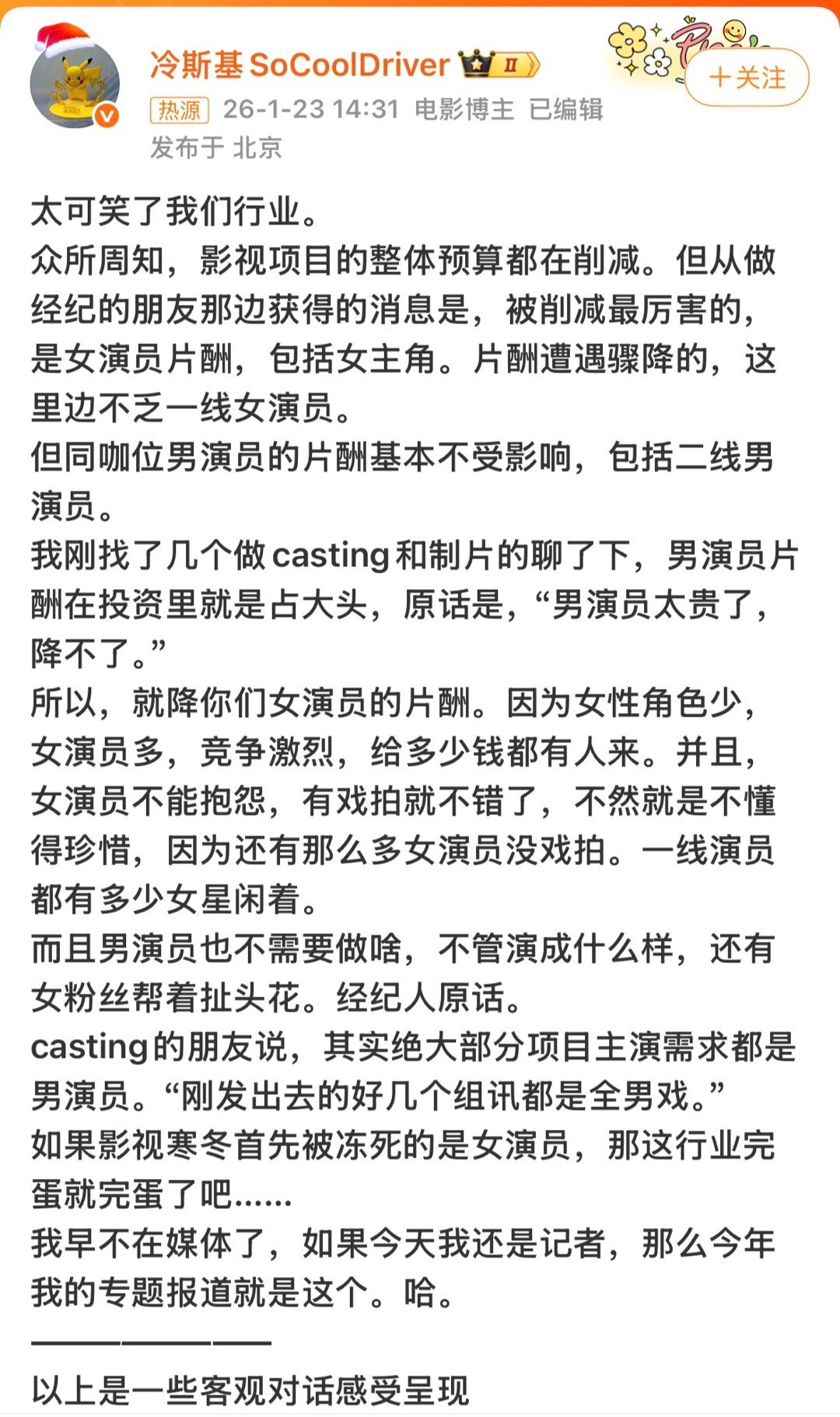 影视项目 削女演员片酬,很正常啊,演员的片酬再少也是普通人的一辈子了吧, 全男戏 根本找不到几个,这是故意挑起对立吧….