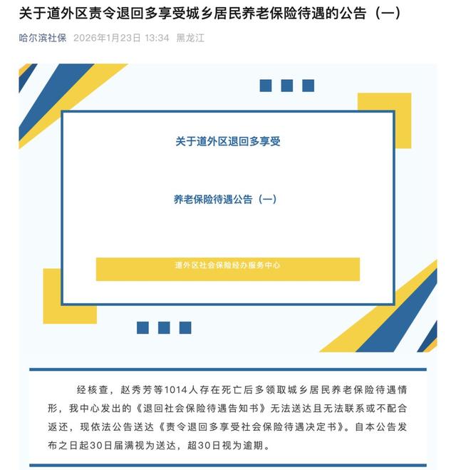 黑龙江哈尔滨市社会保险事业中心官方微信公众号“哈尔滨社保”1月23日发布“关于道外区责令退回多享受城乡居民养老保险待遇的公告”。