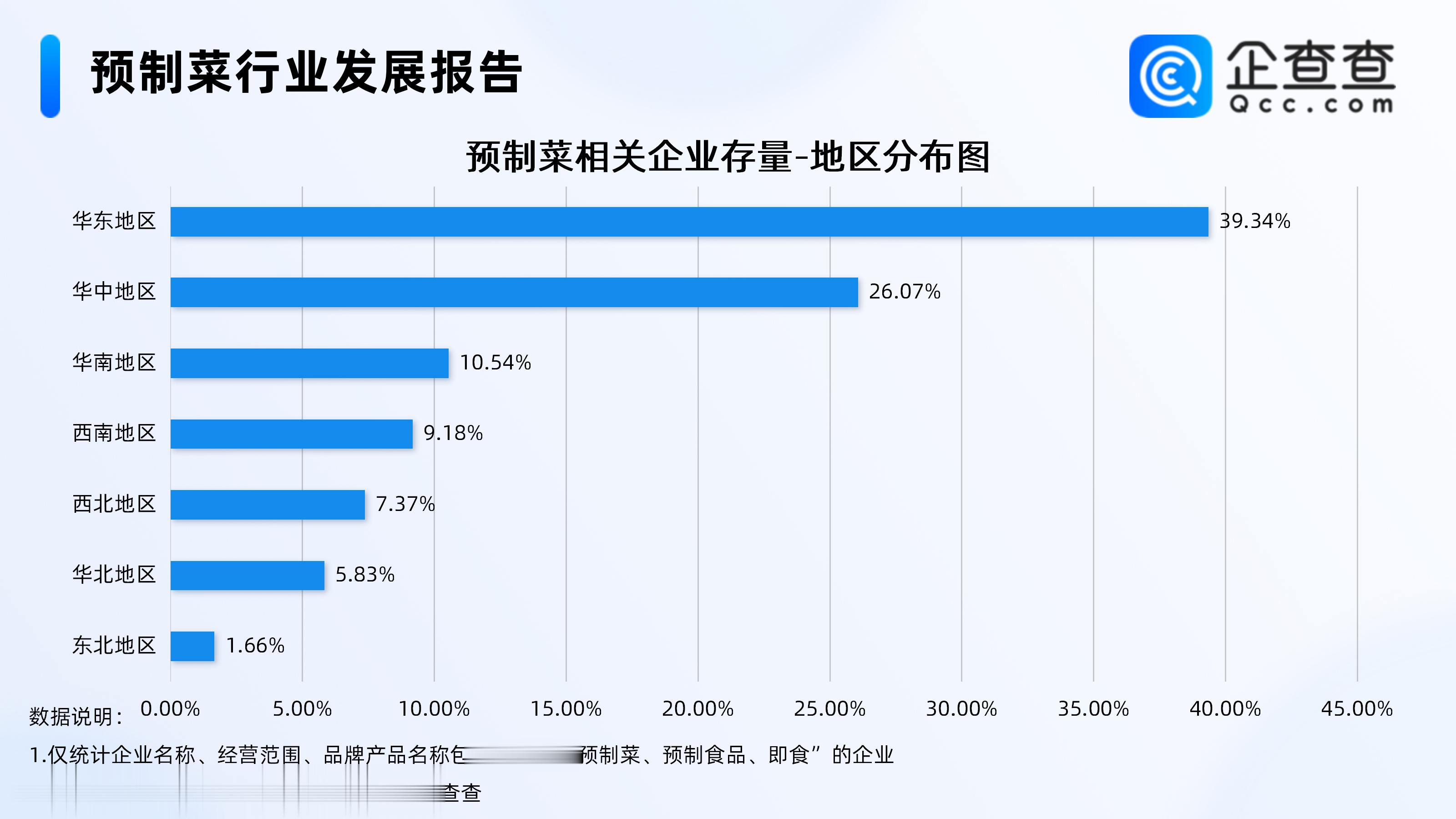 企查查数据显示,从地区分布来看,预制菜相关企业主要分布在华东地区、华中地区,分别占比39.34%、26.07%。其次,分布在华南地区的预制菜相关企业占比10.54%。其余地区占比均不足10%。