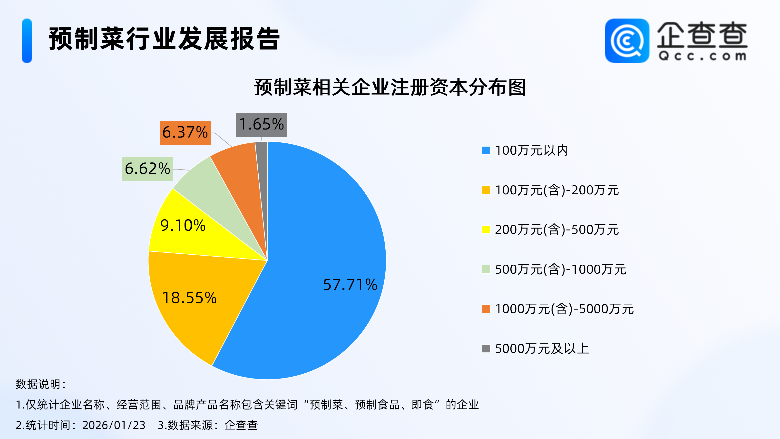 企查查数据显示,截至1月23日,国内现存预制菜相关企业3.23万家。近十年相关企业注册量呈持续增长态势,2025年全年注册1.4万家,同比增长18.58%,增速趋稳。截至目前,今年已注册712家相关企业。存量方面,从注册资本来看,预制菜相关企业多为轻量级企业,注册资本在200万元以下的相关企业占比超七成。从地区分布来看,预制菜相关企业主要分布在华东地区、华中地区,分别占比39.34%、26.07%。