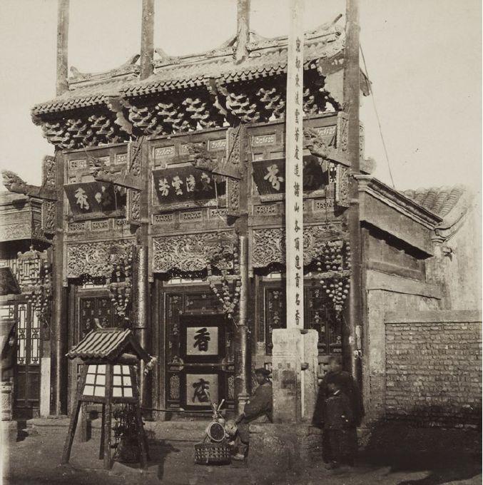 清末北京一家香店的门面,最醒目的是高耸的冲天幌,木杆上写着“龙涎速香 进贡名香”等字样,这种招牌是老北京实力商铺的象征,因制作成本高、视觉冲击力强,能在拥挤的街市中快速吸引客流。 清末北京的香店主要经营祭祀用香、礼佛香与贡香,服务于市民的祭祖、拜佛等日常需求,是当时市井商业的重要组成部分。能竖起高杆招牌的商铺,往往有稳定的货源与良好的口碑,直接向顾客传递了“品质上乘”的信号。