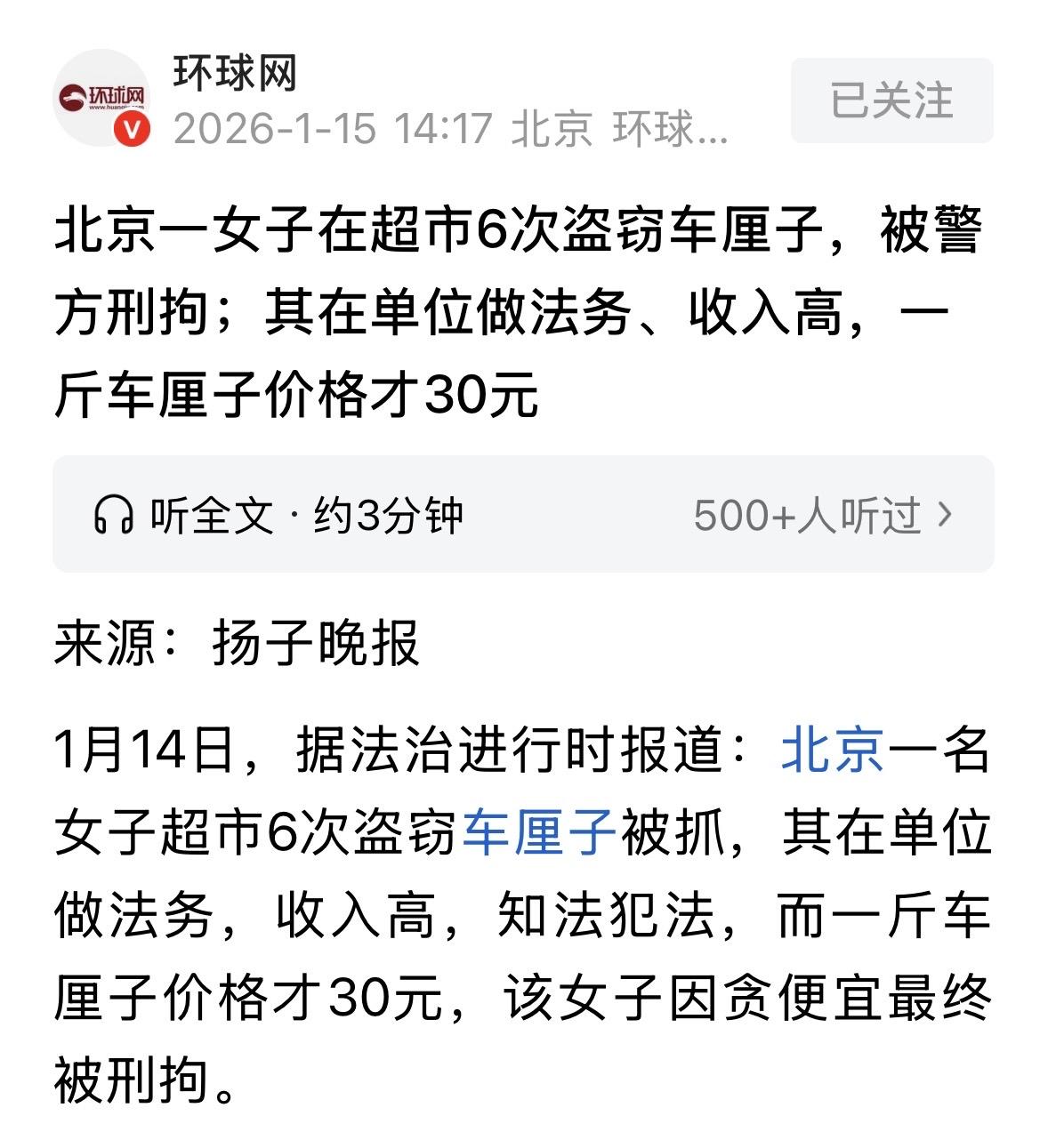 “何必呢?”北京,女子在一家超市6次盗窃车厘子,被抓后,警方发现女子竟是在单位做法务的,她月入过万,不是买不起30元一斤的车厘子,而是贪小便宜成瘾,一次又一次知法犯法,见警察找上门,女子后悔不已,提出按10倍的标准赔偿超市,希望获得谅解,让这事儿过去,可她多次盗窃,已经可以刑事立案,一切都晚了! 一位穿着体面、坐办公室的女白领,竟然因为几盒车厘子,被警察上门请去喝茶了。 这事儿还得从超市的老板小王说起。 最近小王发现,店里老是莫名其妙多出一些空盒子,特别是装车厘子的精致礼盒,扔在角落里,里头光溜溜的,一颗果子不剩。 刚开始还以为是顾客挑剩的,可次数多了,小王就觉得不对劲了,这也太频繁了吧? 他留了个心眼,调了监控,又查了会员记录。这一查,立马锁定了一个老熟人。 这女的是店里会员,每次来都大包小包买不少东西,但手法那是相当老练。 她专挑超市里人少、监控死角的货架,把那一盒盒包装好的车厘子拿过来,利索地把标签撕了,把果子倒进自己随身带的包里或者自备袋子里,然后把空盒子往货架缝隙一塞。 接着,她再去挑点饼干、日用品,若无其事地去收银台结账。 因为她每次都有正常结账的商品,收银员也就扫一眼,谁能想到她自己带的袋子里藏着私货呢? 就这么着,女子前后偷窃了6次车厘子。 小王掌握了实锤,赶紧报了警。民警整理好证据,直接敲开了这位女士的家门。 刚开始,这女的还想演一演。 一看警察站门口,她眼神明显慌了一下,但嘴还硬,说你们找谁?干嘛的? 等民警把超市名字一报,再把那几段监控视频的关键点一说,她那心理防线瞬间就崩了。 她也知道,再装傻充愣就没意思了,只能乖乖配合调查。 到了派出所,这女的才把心里话倒出来。 原来,她是一家公司的法务,专门搞法律的,懂法,收入也不低,压根就不差那点买水果的钱。 这坏心思的起点,其实特别偶然。 一个月前,她去超市买东西,回家一核对小票,发现有个没贴标签的东西居然没被扫码收费,收银员也没发现,防盗门也没响。 那一刻,她心里那个贪小便宜的念头就像野草一样疯长起来了。 她觉得,反正没人发现,这便宜不占白不占。 有了第一次,就有第二次。头一回她还胆小,只敢往包里塞一小盒蓝莓试试水。 结果啥事没有,这下她的胆子肥了,手法也升级了。 从蓝莓变成了三盒车厘子,后来连木瓜、散装干果、饼干都不放过。 她觉得自己特聪明,把超市玩得团团转,殊不知人家超市是没腾出手来细查,真要较真,她那点小九九根本藏不住。 这六次下来,东西倒是没多少钱,车厘子一斤也就30来块,算下来总共也没几百块。但性质变了。 被抓之后,她是真后悔了。作为法务,她太知道盗窃是什么性质了,尤其是多次盗窃,不管金额多少,那都够得上刑事立案了。 她哭着喊着要积极退赔,甚至提出来愿意按十倍的标准赔偿超市,就想求个谅解,让这事儿私了算了。 可法律面前,哪是你想私了就能私了的?超市老板小王也气啊,你这搞了6次,谁知道你下次还来不来?必须得给个教训。 现在,这名女子因为涉嫌盗窃罪,已经被朝阳公安依法刑事拘留了。 哪怕她工作再光鲜,哪怕她愿意赔十倍的钱,这案底是背定了。 一个搞法律的人,知法犯法,为了这点蝇头小利把自己的职业生涯和清白搭进去,真是典型的聪明反被聪明误。 《刑法》第264条规定:盗窃公私财物,或者多次盗窃的,处三年以下有期徒刑、拘役或者管制,并处或者单处罚金。 如果只偷了一次,哪怕偷了几百块,可能只是行政拘留几天。 但是,法条里有一个非常硬性的指标叫,多次盗窃,指2年内盗窃3次以上。 女子在一个月内连续作案6次,远远超过3次的红线。 只要次数够了,哪怕你每次只偷了一根葱、一颗糖,加起来总金额只有几十块钱,也直接构成盗窃罪,必须追究刑事责任,面临的是判刑、拘役以及留下案底,而不仅仅是赔钱了事。 这就是为什么她愿意赔偿,超市却不答应,因为这已经上升到了公诉的层面。 这名女子的身份很特殊,她是法务,懂法,收入高。 在刑法理论中,她的行为属于直接故意。 她第一次发现漏洞后,不是想着去提醒超市,而是利用这个漏洞反复获利。 作为懂法的人,她非常清楚多次盗窃的后果,却依然抱着不会被发现的侥幸心理,觉得自己手法隐蔽、金额小。 这种知法犯法的情节,虽然不一定会加重量刑,往往被视为主观恶性较大,很难获得缓刑或不起诉的机会。 对此,你怎么看? 关注@运良说法 学法律知识不迷路
