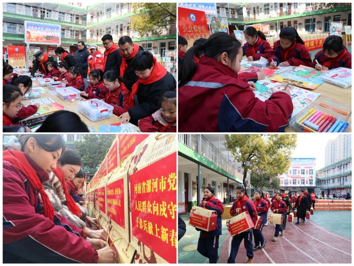 大爱满沙澧,情暖子弟兵。为致敬坚守祖国边防一线的官兵,传递漯河人民的尊崇与牵挂,1月23日,漯河市退役军人事务局联合漯河军分区政治工作处、郾城区退役军人事务局、郾城区伊坪小学,共同举办“情系边海防官兵”2026年春节专项慰问物资启运仪式,将满载全市社会各界深情厚谊与少年童心祝福的慰问物资整装发往边关,以实际行动书写双拥共建的暖心篇章。新时代卫国戍边英雄王焯冉烈士的父亲王恒召、母亲杨素香,漯河军分区政治工作处主任龙亮,市退役军人服务中心主任彭晓君,郾城区退役军人服务中心主任炊要文,郾城区伊坪小学校长李静,漯河市退役军人事务局“五朵金花工作室”志愿者及300余名伊坪小学师生参加活动。