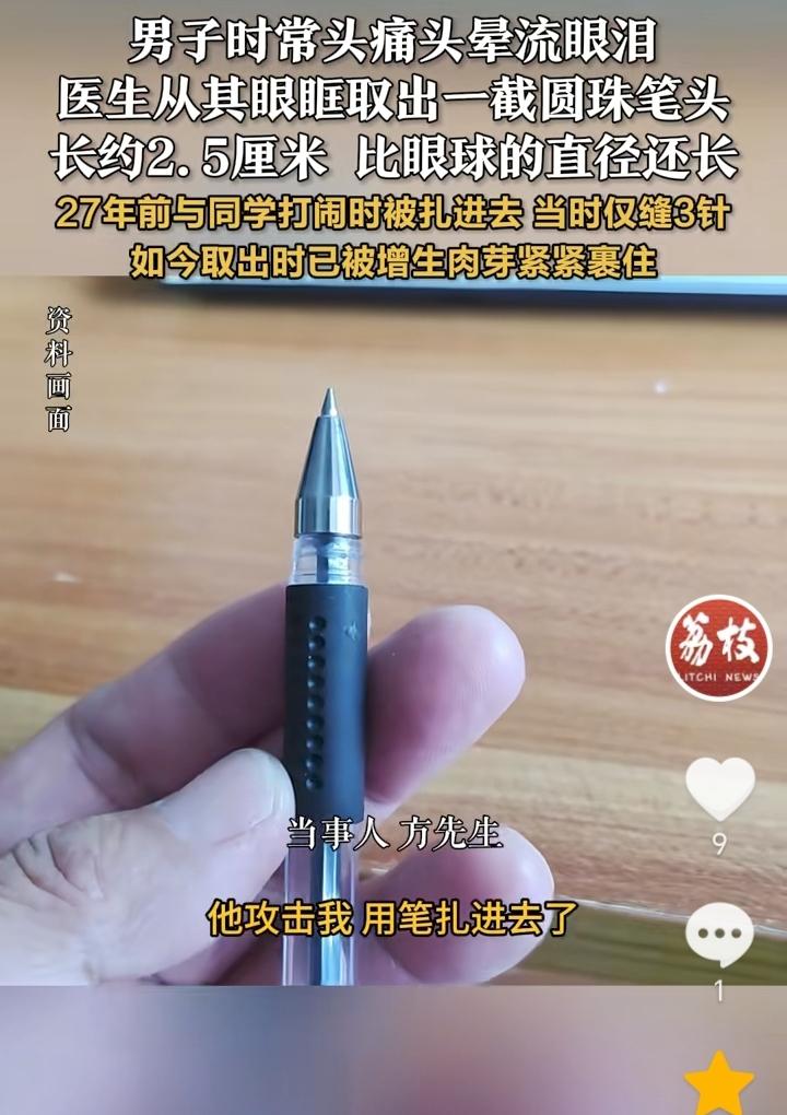 “是个狠人”!山东菏泽,男子时常头疼头晕流眼泪,到医院检查后发现眼睛里有异物,结果从男子眼眶里取出来了一节圆珠笔头,长约2.5厘米,比眼球的直径还长,至于圆珠笔头什么时候扎进去的,这件事还要回溯到27年前,当时男子和同学打闹,同学攻击他,用笔扎进眼睛里,医院当时没做其他检查,仅缝了三针,现在取出来已经被增生肉芽紧紧裹住。 男子这同学也是个狠人,竟然敢直接用笔尖扎同学眼睛,幸运的是当时眼睛还没事,只是缝了三针,现在时隔27年后才有了反应。 当时也是大意了,没让医生检查一下,如果检查当时都能发现,然后直接就给取出来,后面也不会出现头痛头晕流眼泪的症状。 家长要多教育孩子,和同学打闹玩一定要注意分寸,万一受伤留下后遗症就成了隐患。