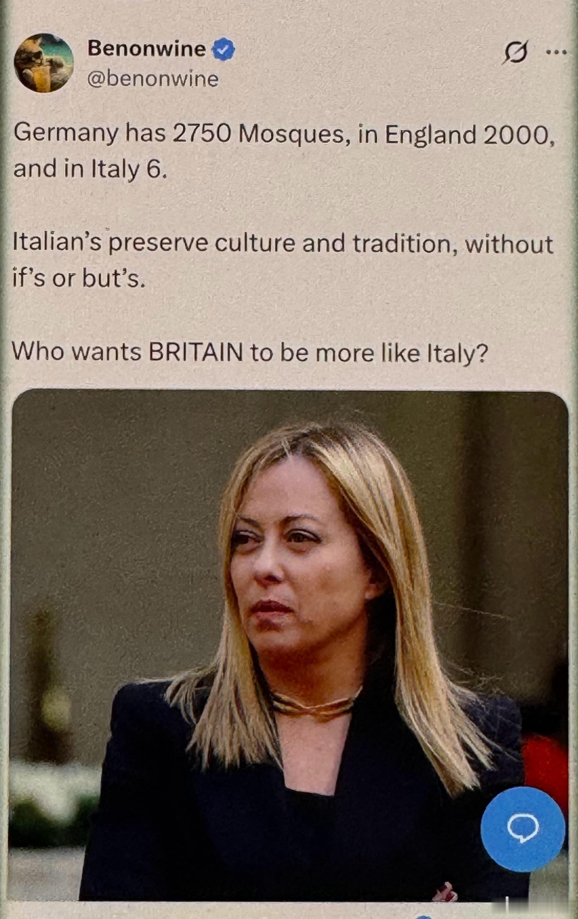 德国有2750座清真寺,英国有2000座,而意大利只有6座。意大利人毫无保留地守护着自己的文化与传统。谁想让英国变得更像意大利?🔥这波带节奏堪称教科书级!先甩一个“意大利只有6座清真寺”的假数据,再绑定“守护文化传统”的政治正确,最后用一句反问把英国网友架在道德火上烤。明眼人都懂,意大利真实的清真寺数量远不止6座,这种刻意编造的数据,本质是借“文化保护”的名义煽动排外情绪。但架不住流量密码好用:“文化入侵”“身份认同”戳中欧洲右翼痛点,梅洛尼的配图又强化了“强硬反移民”的人设。不管数据真假,只要能让网友在“多元包容”和“文化保守”里站队互撕,这条内容就赢麻了。毕竟在舆论场,情绪永远比事实传播得更快。重要提醒:核心数据完全虚假:帖子中“意大利只有6座清真寺”的说法与事实严重不符。根据意大利伊斯兰宗教团体和第三方机构的统计,意大利目前有超过800座清真寺及伊斯兰祈祷场所,仅罗马就有20余座。这种刻意编造的数据,是为了给“意大利守护文化传统”的极端叙事提供虚假支撑。余丰慧