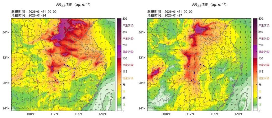 24日、27日湖北省及北方上游污染物积累模式预测图