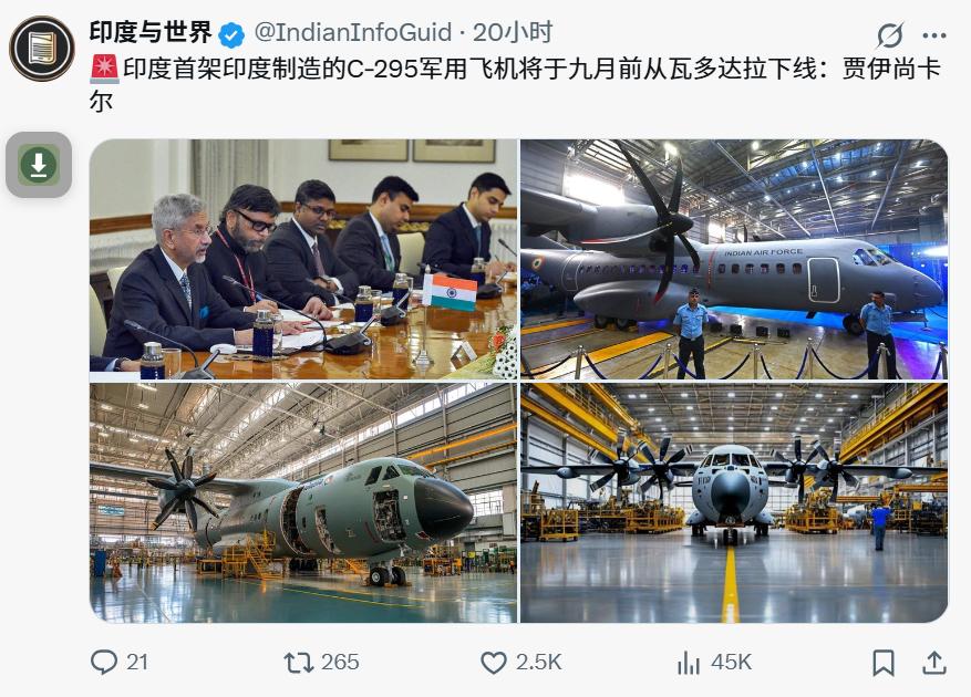 印度媒体发布消息:印度首架印度制造的C-295军用飞机将于2026年9月前从瓦多达拉工厂正式下线。前有印度光辉战机,现在又有C-295军用飞机,对此大家怎么看?印度