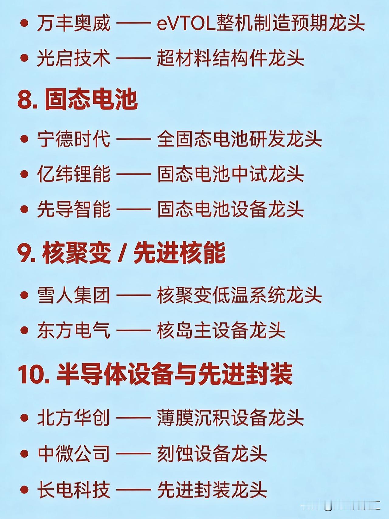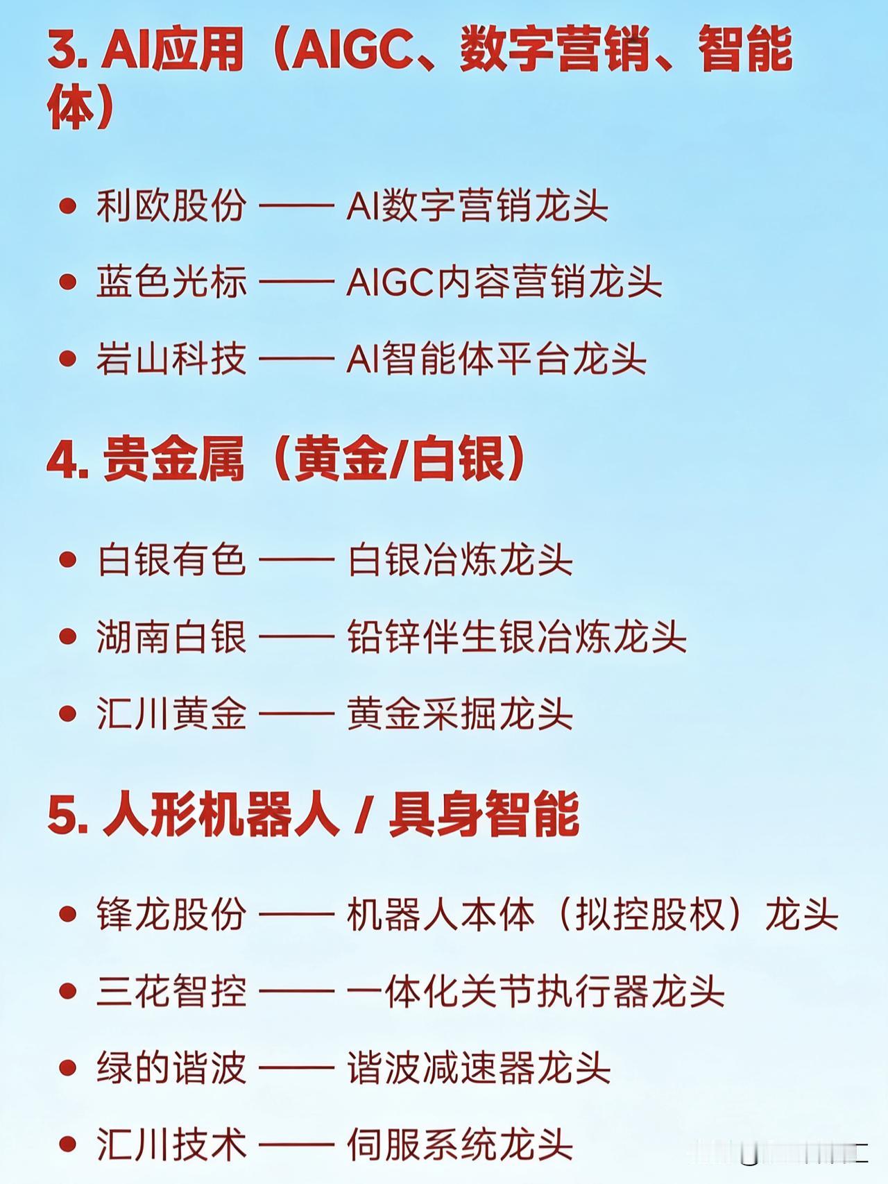 2026年1月23日十大热点概念核心企业 1. 商业航天 航天电子 —— 卫星配套系统龙头 巨力索具 —— 航天结构件龙头 中超控股 —— 商业航天连接器龙头 2. 太空光伏 / 高效电池(HJT/钙钛矿) 隆基绿能 —— 光伏组件龙头 国晟科技 —— HJT/TOPCon电池龙头 捷佳伟创 —— 光伏设备(含钙钛矿)龙头 3. AI应用(AIGC、数字营销、智能体) 利欧股份 —— AI数字营销龙头 蓝色光标 —— AIGC内容营销龙头 岩山科技 —— AI智能体平台龙头 4. 贵金属(黄金/白银) 白银有色 —— 白银冶炼龙头 湖南白银 —— 铅锌伴生银冶炼龙头 山东黄金 —— 黄金采掘龙头 5. 人形机器人 / 具身智能 锋龙股份 —— 机器人本体(拟控股权)龙头 三花智控 —— 一体化关节执行器龙头 绿的谐波 —— 谐波减速器龙头 汇川技术 —— 伺服系统龙头 6. 算力基础设施(AI服务器/液冷) 中国长城 —— 信创+AI整机龙头 中科曙光 —— 液冷智算中心龙头 英维克 —— 液冷散热方案龙头 7. 低空经济(eVTOL/无人机) 万丰奥威 —— eVTOL整机制造预期龙头 光启技术 —— 超材料结构件龙头 8. 固态电池 宁德时代 —— 全固态电池研发龙头 亿纬锂能 —— 固态电池中试龙头 先导智能 —— 固态电池设备龙头 9. 核聚变 / 先进核能 雪人集团 —— 核聚变低温系统龙头 东方电气 —— 核岛主设备龙头 10. 半导体设备与先进封装 北方华创 —— 薄膜沉积设备龙头 中微公司 —— 刻蚀设备龙头 长电科技 —— 先进封装龙头