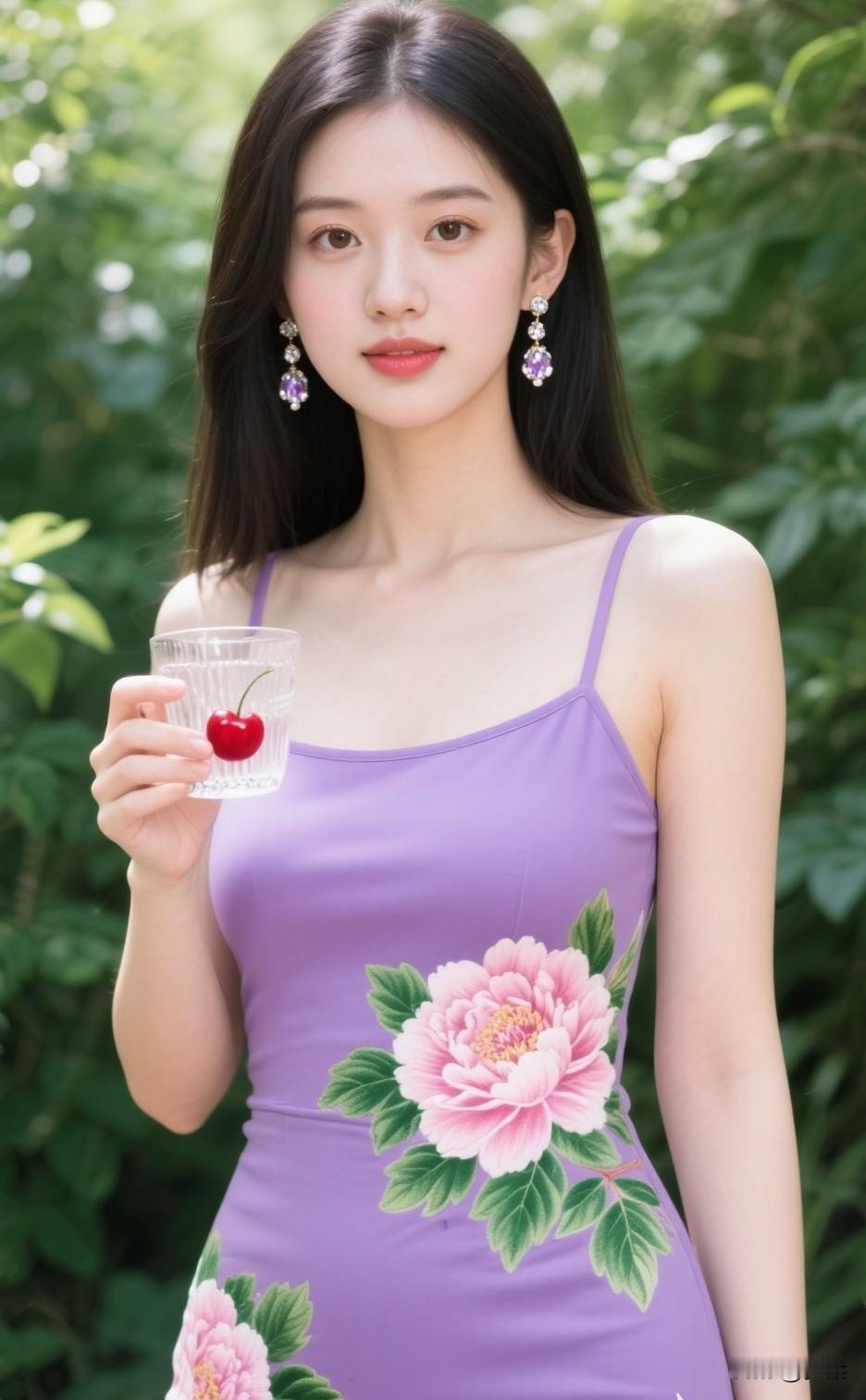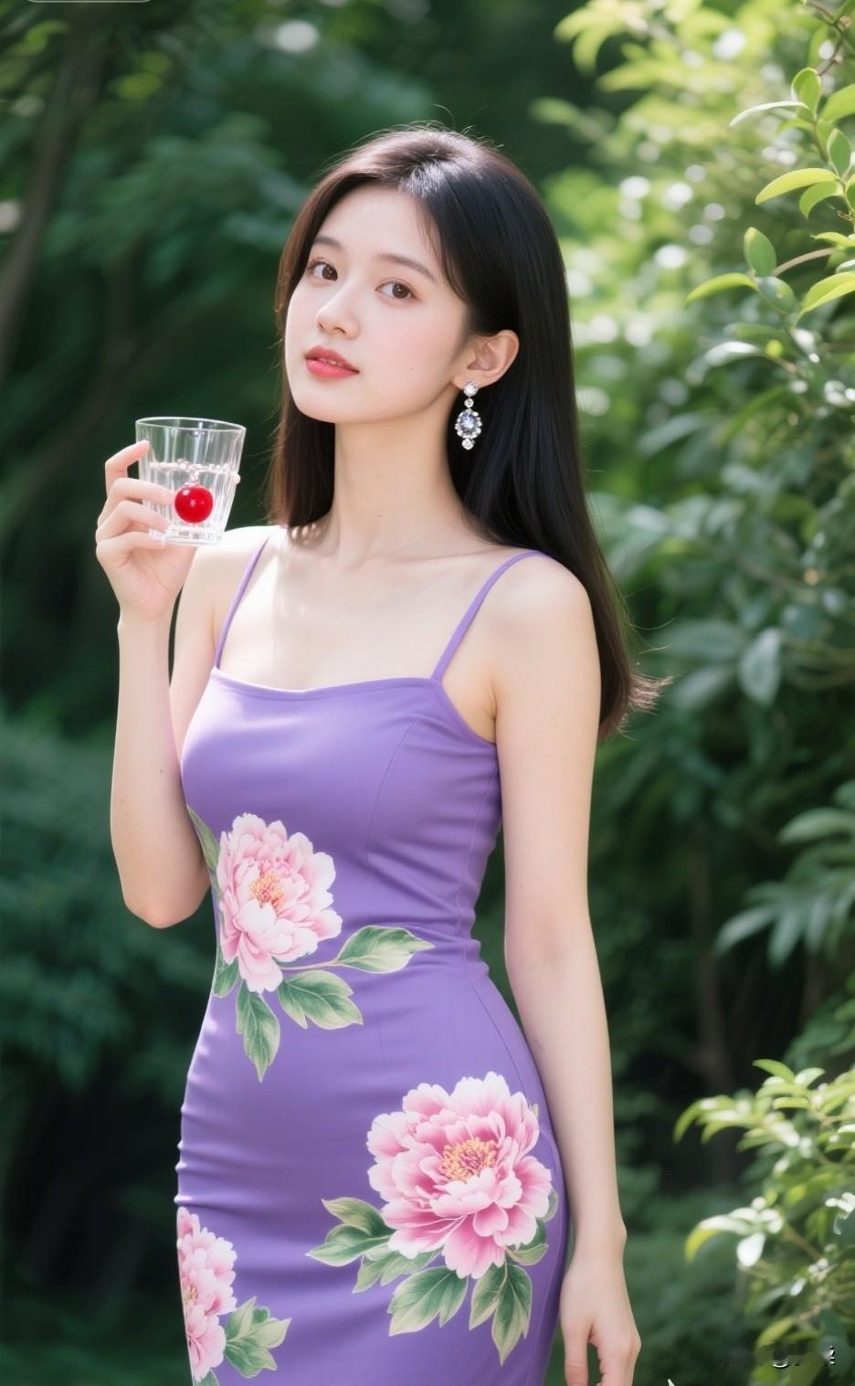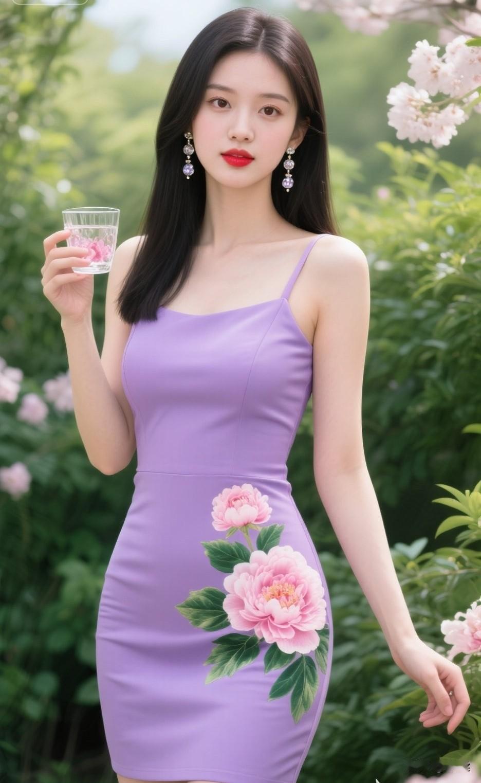 紫衣美人倚花丛,玉杯轻啜意自闲紫裙花影
