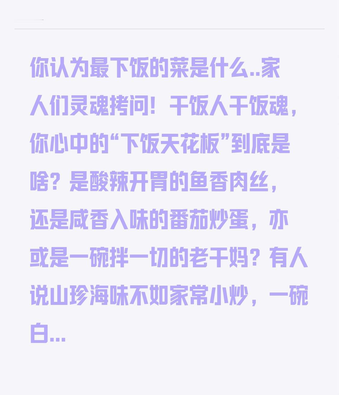 你认为最下饭的菜是什么.. 家人们灵魂拷问!干饭人干饭魂,你心中的“下饭天花板”到底是啥?是酸辣开胃的鱼香肉丝,还是咸香入味的番茄炒蛋,亦或是一碗拌一切的老干妈?有人说山珍海味不如家常小炒,一碗白饭配对菜,能多干三碗饭!今天咱们就聊聊,那些刻在中国人DNA里的下饭神菜! 要说下饭,那必须是家常菜才最有灵魂!南北口味虽不同,但藏在烟火气里的下饭神菜,总能戳中味蕾!南方朋友的本命,大概率是酸辣口的——鱼香肉丝勾着甜辣酱汁,笋丝木耳脆嫩爽口,拌在白饭里,每一粒米都裹满汤汁,炫饭根本停不下来;麻婆豆腐嫩到入口即化,麻辣鲜香直钻鼻腔,一勺豆腐配一口饭,连汤汁都舍不得浪费。 北方朋友的下饭王者,那必须是咸香浓郁的硬菜!番茄炒蛋酸甜解腻,鸡蛋吸满番茄的汁水,拌米饭堪称“国民下饭菜”,大人小孩都爱吃;土豆丝酸辣脆爽,刀工好不好不重要,够味才是关键,一口土豆丝一口饭,简单却百吃不厌。还有那碗万能的榨菜肉丝,咸鲜微辣,配白粥、拌米饭都绝了,打工人的午餐有它,瞬间幸福感拉满! 除了这些经典款,各地还有专属下饭神器:四川的回锅肉、湖南的剁椒鱼头、江西的炒辣椒、东北的地三鲜,就连一碗简简单单的拍黄瓜,加勺生抽香醋,都能让人多干一碗饭。这些菜未必山珍海味,却胜在入味、够味,精准踩中干饭人的味蕾密码。 有人可能会说,现在大餐吃多了,山珍海味摆在面前,反而不如一碗家常小炒下饭,这到底是为啥?其实关键转折就在这里——最下饭的菜,从来不是多贵的食材,而是藏在里面的烟火气和人情味!山珍海味能满足口腹之欲,却少了家常味的温暖;精致料理摆盘精美,却少了拌米饭的随性。 我们爱吃的那些下饭神菜,吃的不仅是味道,更是回忆:是妈妈下班回家,系着围裙在厨房炒的那盘番茄炒蛋,是爸爸喝小酒时,随手炒的一盘土豆丝,是在外打拼时,一碗榨菜肉丝饭解了乡愁。哪怕是一碗白饭,拌上一勺外婆做的肉酱,都比任何大餐都香,因为这味道里,藏着家人的爱,藏着童年的回忆,藏着独属于我们的人间烟火。 而且下饭神菜的精髓,从来都是“适配”——不用讲究摆盘,不用在意吃法,端着碗拌一拌,大口扒饭,吃得酣畅淋漓,这才是干饭的快乐!比起精致的分餐,这种随性的吃法,更贴近中国人的饮食习惯,也更有生活的味道。 其实每个人心中,都有一道专属的下饭神菜,它未必是公认的经典,却一定是刻在记忆里的味道。可能是小时候生病,妈妈熬的一碗清汤面卧个蛋,可能是上学时,食堂阿姨多给的一勺红烧肉,可能是在外工作,自己随手炒的一盘青菜。 这道下饭神菜,藏着我们对生活的热爱,藏着平凡日子里的小美好。生活再忙,工作再累,只要有一碗热腾腾的白饭,配上自己爱吃的那道菜,所有的疲惫都能被治愈。干饭的快乐,从来都很简单,一口饭一口菜,吃得满足,就是最幸福的事。 我们怀念的不是某一道菜,而是吃这道菜时的心情,是陪我们吃这道菜的人。那些家常的味道,串联起我们的一生,成为刻在骨子里的温暖。 说到底,最下饭的菜,从来无关价格,无关食材,而是藏在烟火气里的温暖,藏在人情味里的感动。它是妈妈的味道,是家乡的味道,是平凡日子里,最踏实的幸福。 人间百味,抵不过一碗家常饭。无论走多远,无论吃过多好的大餐,回头发现,最香的还是家里那碗配着小炒的白米饭。愿我们都能被人间烟火温柔以待,有饭吃,有人爱,有一口下饭的菜,温暖度过三餐四季。 评论区聊聊!你心中的“下饭天花板”是什么菜?是妈妈做的家常菜,还是某道街边小吃?分享你的故事,点赞关注,一起聊聊那些让我们多干三碗饭的下饭神菜!