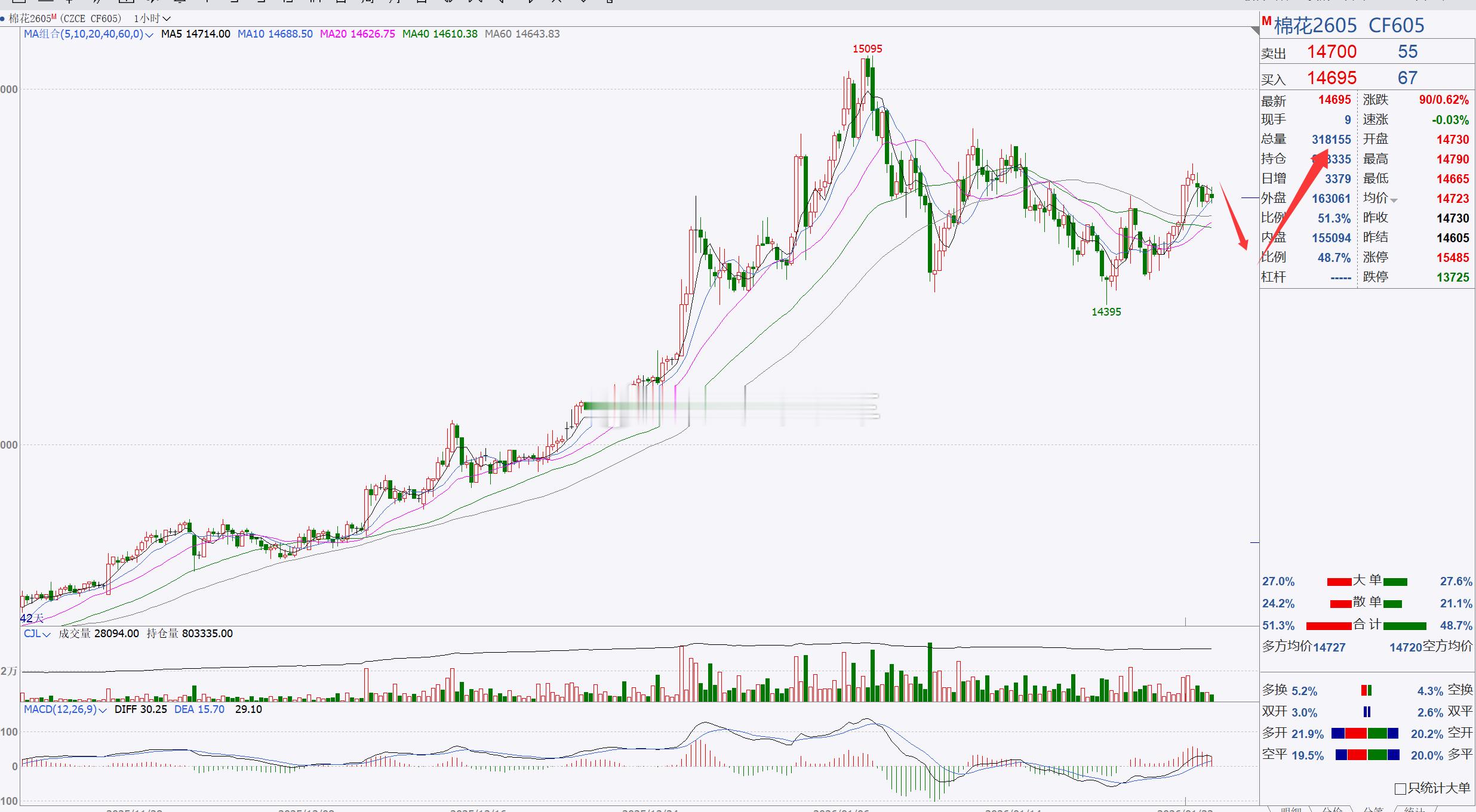 1、【豆油2605】豆油关注8000一带,建议短线跟进!豆油目前伴随着逐步上调阶段,后市建议关注8000整数一带,若此位置企稳,豆油还有反弹调整预期,但不过分空间,短线跟进即可;稳健者建议先观望;例如多关注8040—8020附近,上方先关注8200附近;空关注8200突破情况再择机考虑介入;(建议仅供参考,具体操作以开盘点位实时跟进,据此操作风险自担)2、【棉花2605】棉花建议短线跟进,重点关注15000一带!棉花回踩后,日内伴随着短期反弹修正,整体行情表现一般,后市建议短线跟进即可;稳健者建议先观望;例如多关注14600—14550附近,上方先关注14850附近,突破再关注15000附近;空关注14850、15000这两个位置再择机考虑介入;(建议仅供参考,具体操作以开盘点位实时跟进,据此操作风险自担)豆油棉花菜油