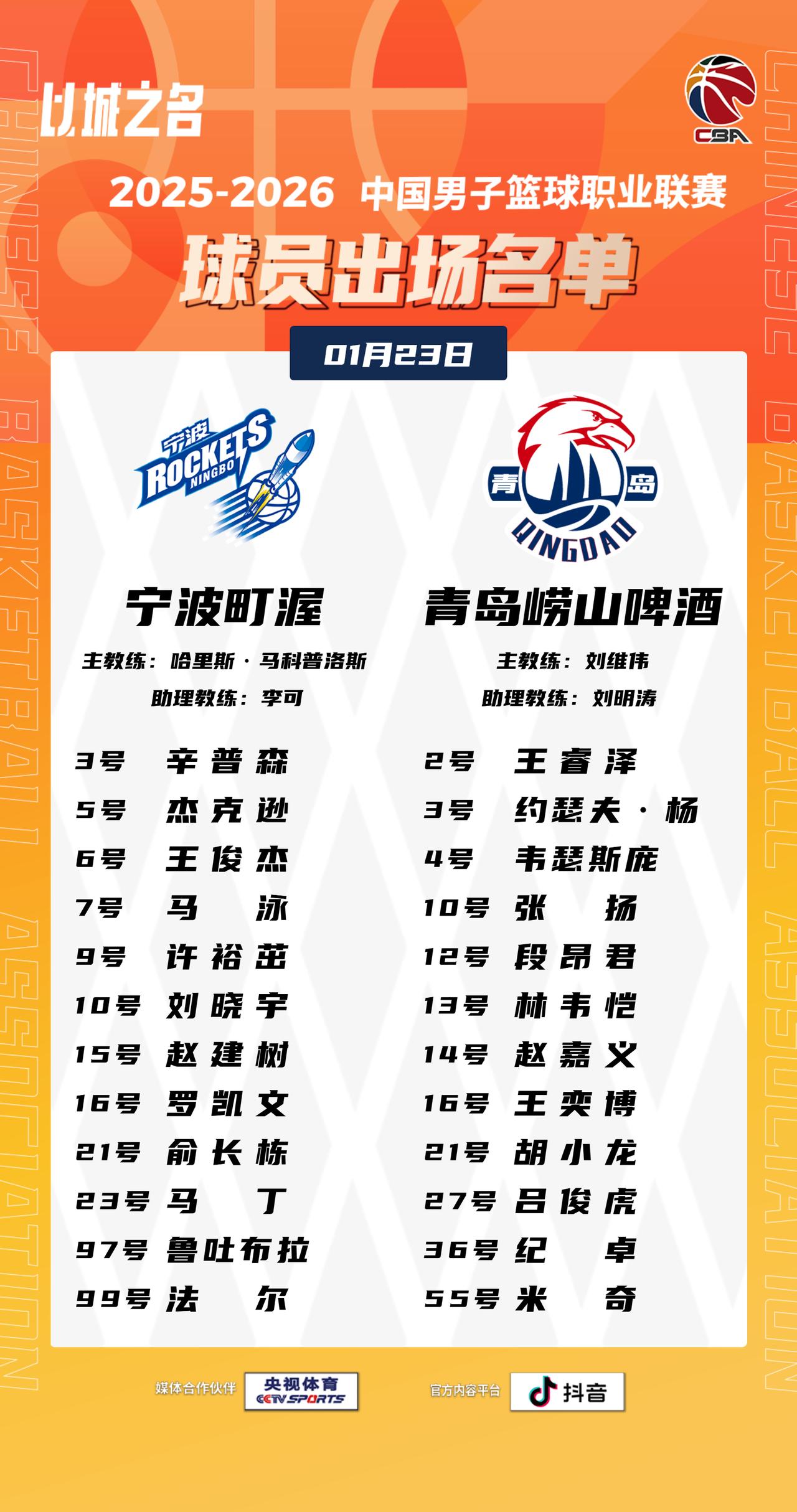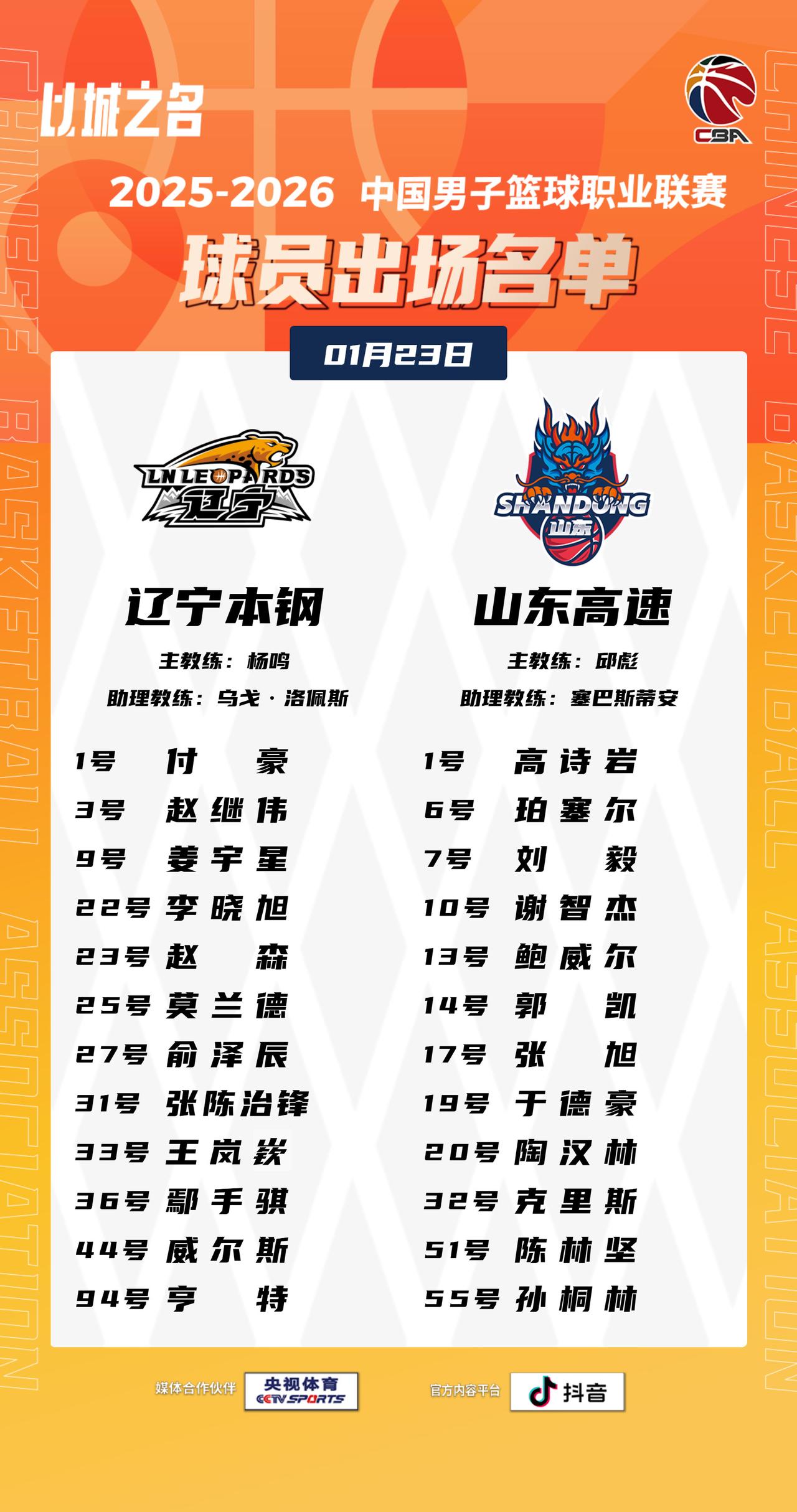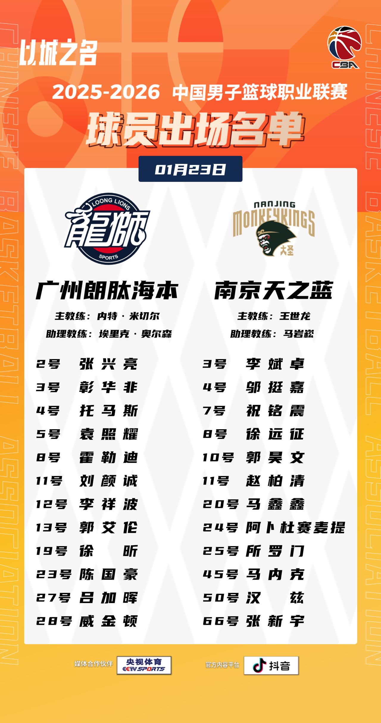 【大名单出炉】2025-2026赛季CBA联赛常规赛第十八轮今晚继续进行,4场比赛将在19:35同时跳球,敬请期待!