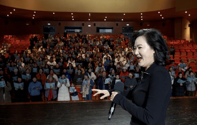 活动当晚,现场氛围热烈而温馨。18时许,滨州大剧院前厅已热闹非凡,参与市民陆续到场扫码签到、拍照打卡,领取歌词折页,提前熟悉歌曲旋律。18时30分,大家有序入场就座,期待着这场音乐盛宴的开启。19时,活动正式拉开帷幕,本期授课教师、山东航空学院声乐教师周菲登台指导。作为资深声乐教育者与女高音歌唱家,周菲凭借专业的功底,从发声技巧、气息控制、和声配合等方面细致讲解,耐心纠正每一个细节,帮助大家快速找到演唱状态。